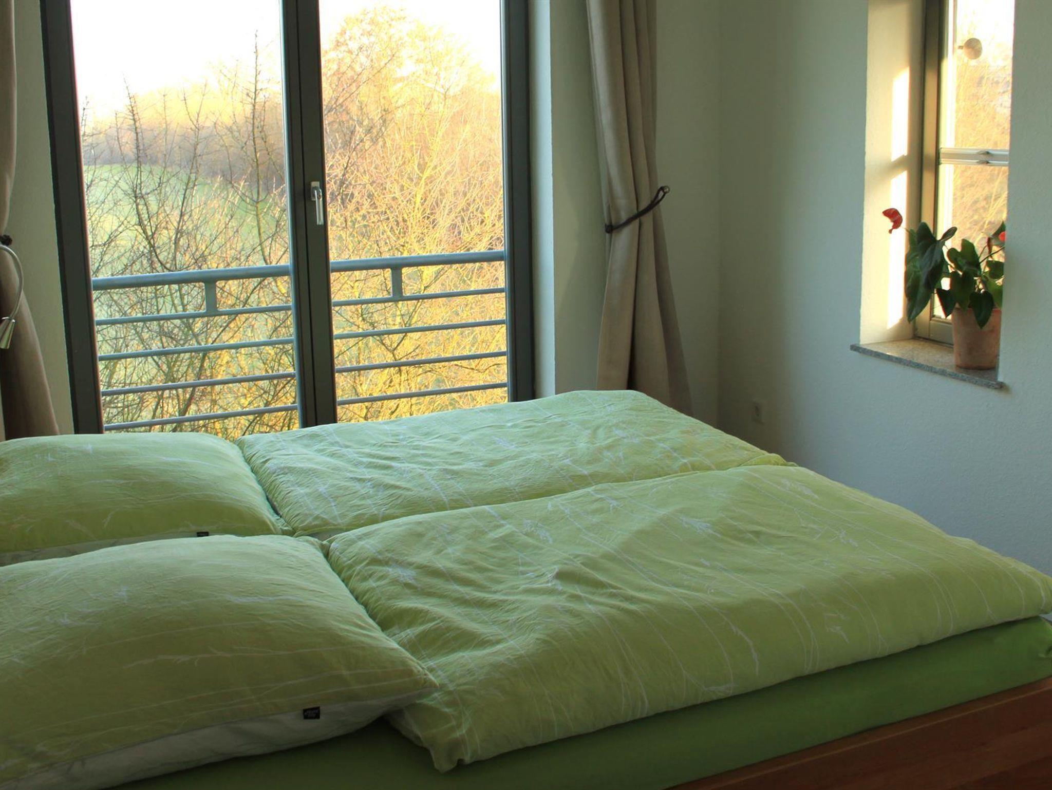 Die Wohnnung liegt im 1. Stock unseres Hauses, sodass Sie von dort einen einzigartigen Blick über die Wiesen und Weiten der Umgebung haben. Bodentiefe Fenster zur Süd-und Westseite lassen viel Licht in die Räume.