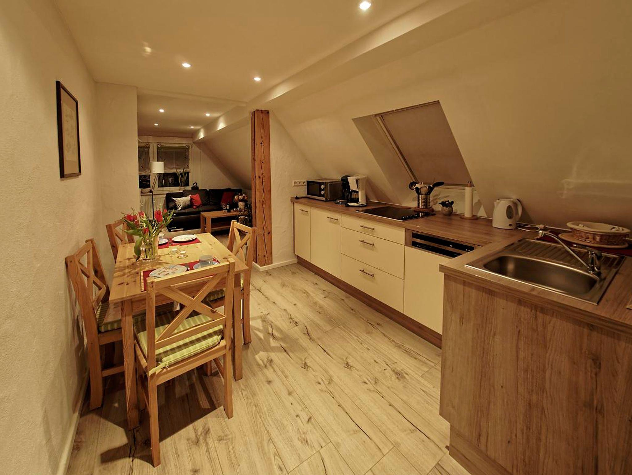 • Wohnküche mit 4-Platten-Herd, Mikrowelle, Kühlschrank, Geschirrspülmaschine, Wasserkocher, Kaffeemaschine