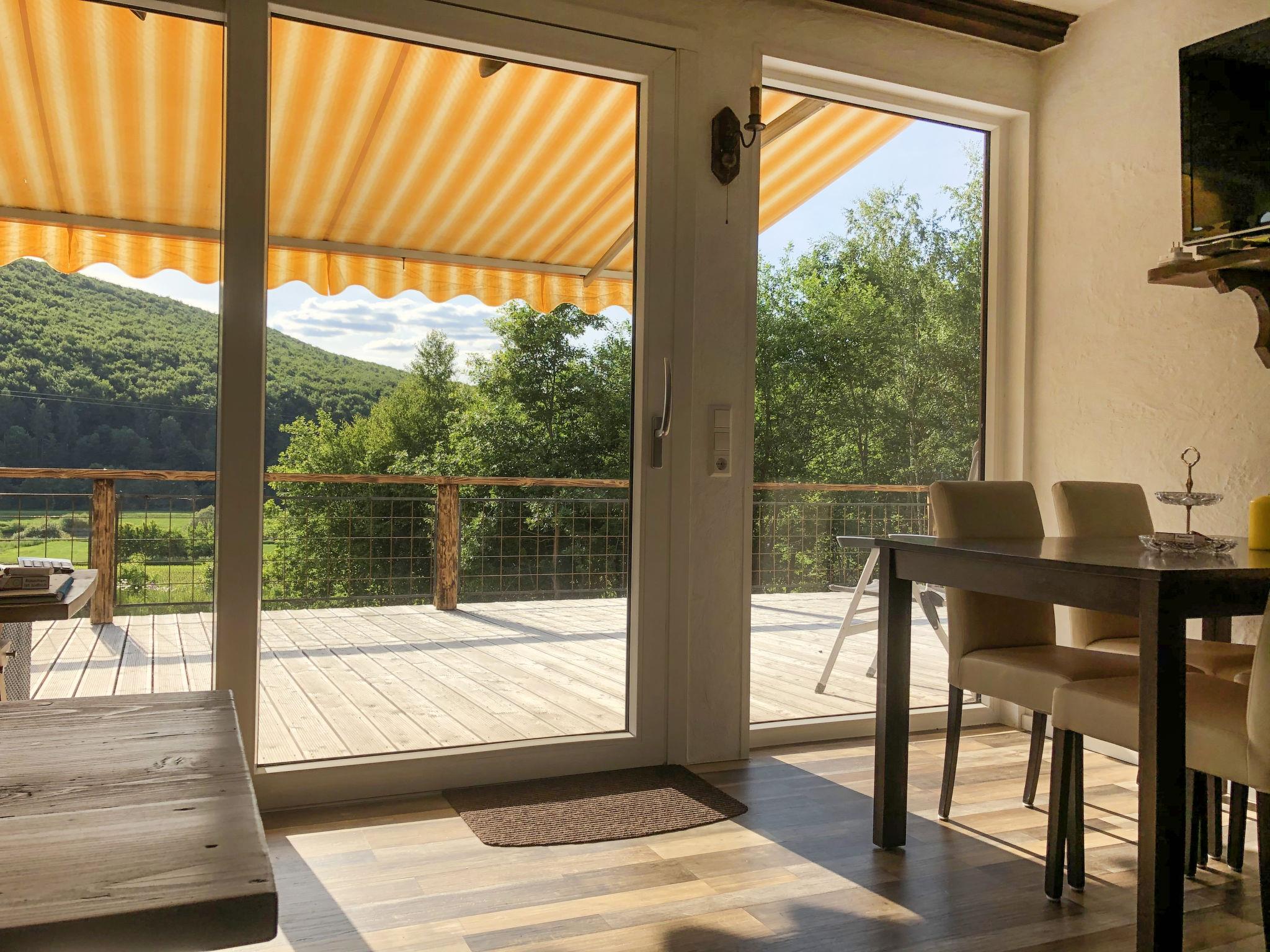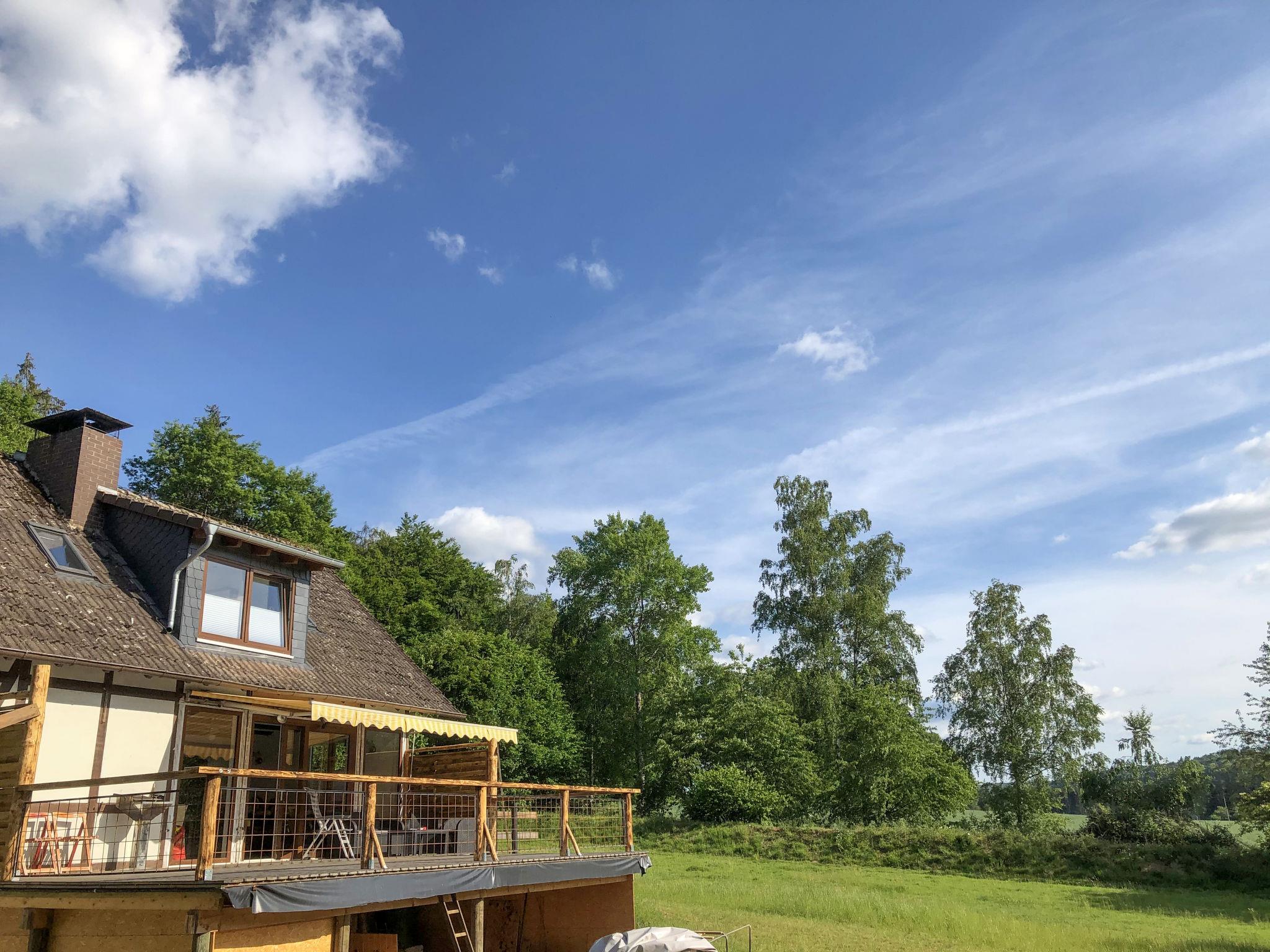 Timber house "Haus am Fluss", detached, surrounded by trees, meadows and fields. In the district of Wahmbeck 8.7 km from the centre of Bodenfelde, in a quiet, elevated position, 10 m from the edge of the forest, 250 m from the river, in the countryside. Private: natural state property 3'660 m2 with lawn and wildlife garden, natural garden, lawn for sunbathing 1'000 m2. In the house: central heating system. Parking at the house. Shop 10 km, grocery 10 km, supermarket 10 km, restaurant 10 km, bakery 10 km, bus stop 8.7 km, railway station "Bodenfelde" 8.7 km, ferry "Weserfähre (Sommer/Herbst)" 3.5 km. Walking paths from the house 10 m. Nearby attractions: Bad Karlshafen 6.5 km, Höxter, Kloster Corvey, Solling Neuhaus 25 km. Please note: car recommended. This detached half-timbered house stands in a completely secluded location, without neighbors, directly on the Weser Cycle Path. The basement features a small apartment, occasionally used by the owner.