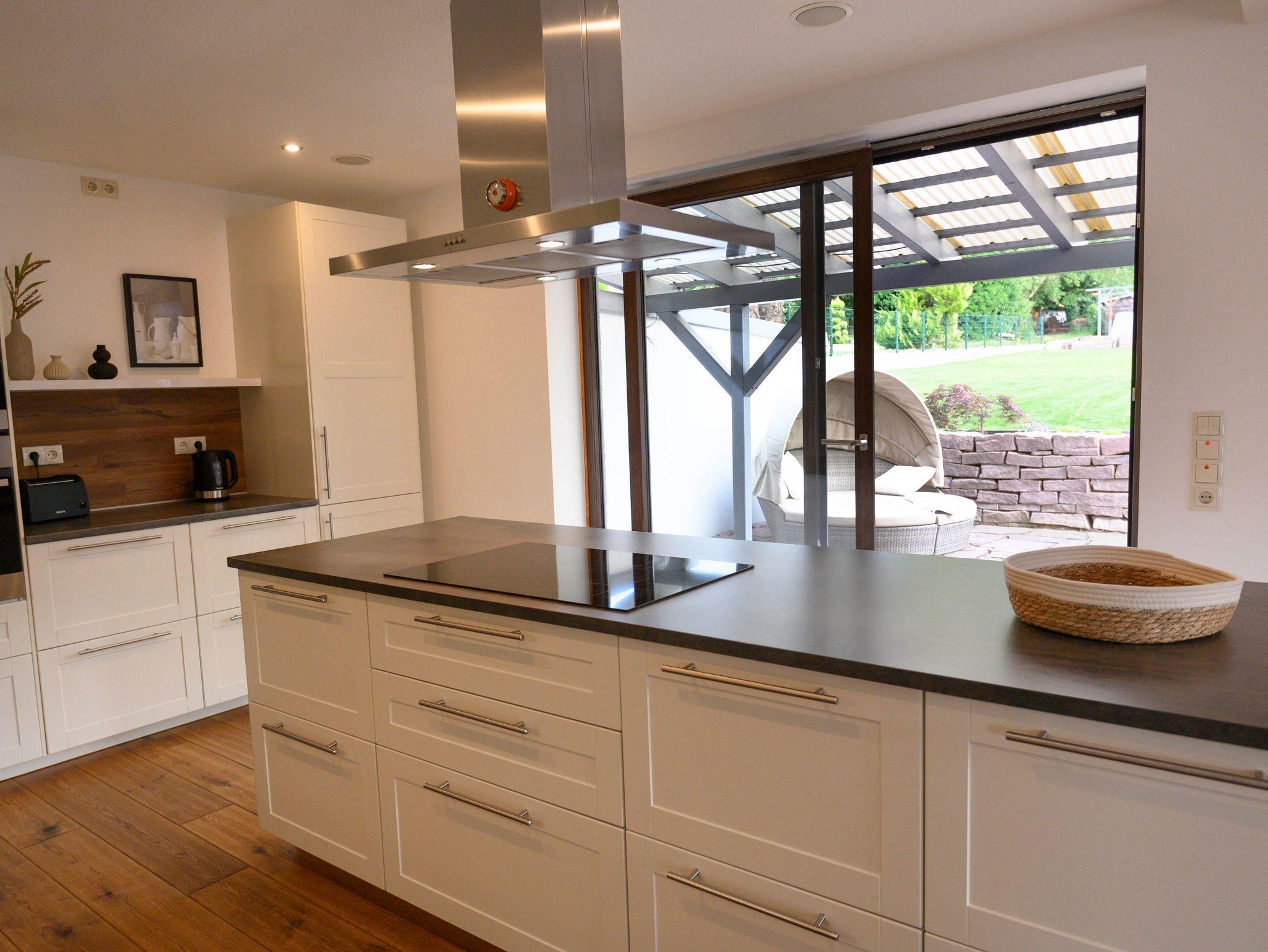 In der Küche ist alles vorhanden Spülmittel, Geschirrhandtücher, Geschirrspülmaschine, Küchenmesser-Set, Kaffeemaschine, Pad-Maschine, Toaster, Mixer, Backformen, Eierkocher, Teekanne, Wasserkocher, Tee-Auswahl, Backofen, Mikrowelle, Kühl-/Gefrierschrank mit Eiswürfelmaschine, großzügige Kochinsel mit Zugang zur Terrasse.