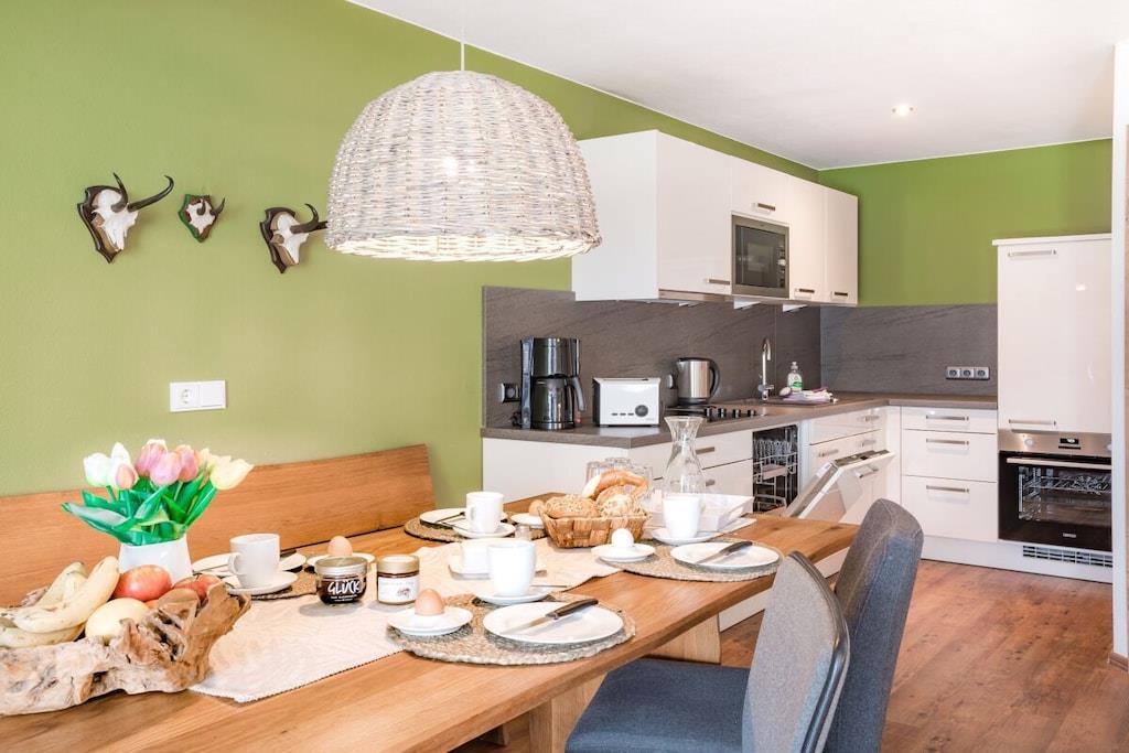Ferieleiligheten Wiesenblick (94 kvm), innredet i moderne landlig stil, ligger i første etasje med en sørøstvendt terrasse og uhindret utsikt over Øvre Allgäu-fjellene. Den har en stue med designergulv, en sittegruppe, en flatskjerm-TV, en koselig spiseplass og et fullt utstyrt kjøkken med alle moderne bekvemmeligheter. Det er to soverom med dobbeltsenger og et eget bad med dusj/toalett. Leiligheten har plass til opptil 6 personer. På grunn av stor etterspørsel kan leiligheten være fullbooket. Alternativt tilbyr vi deg gjerne en lignende innkvartering i samme bygning eller i et av våre andre feriehus, uten forpliktelser. En detaljert oversikt over våre ferieinnkvarteringer finner du på www.aparthaeuser-steiner.de.
