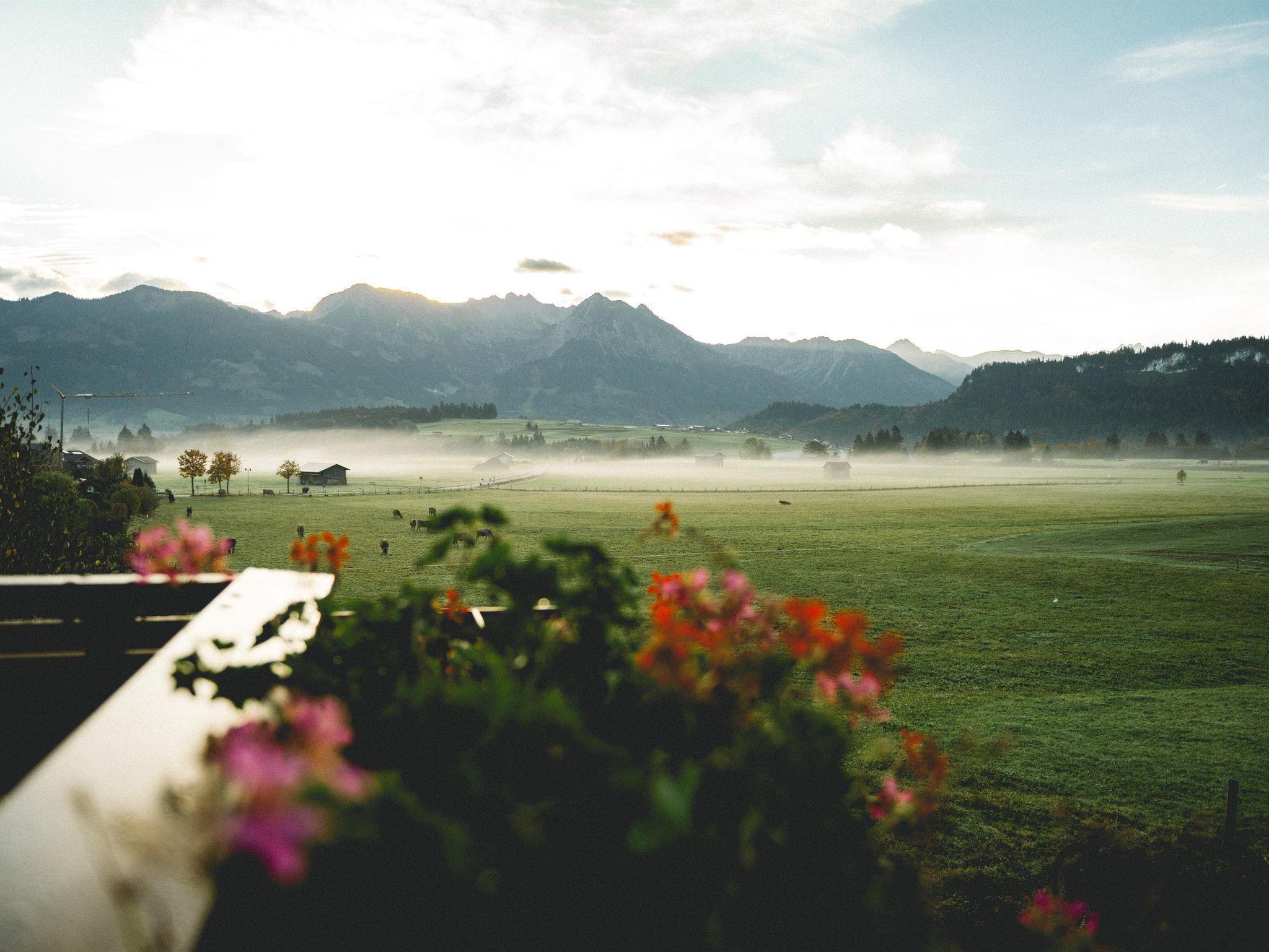 Grüne, blühende Wiesen mit den grasenden Kühen und der fantastische Bergkulisse im Hintergrund sehen Sie von allen Wohnung aus.