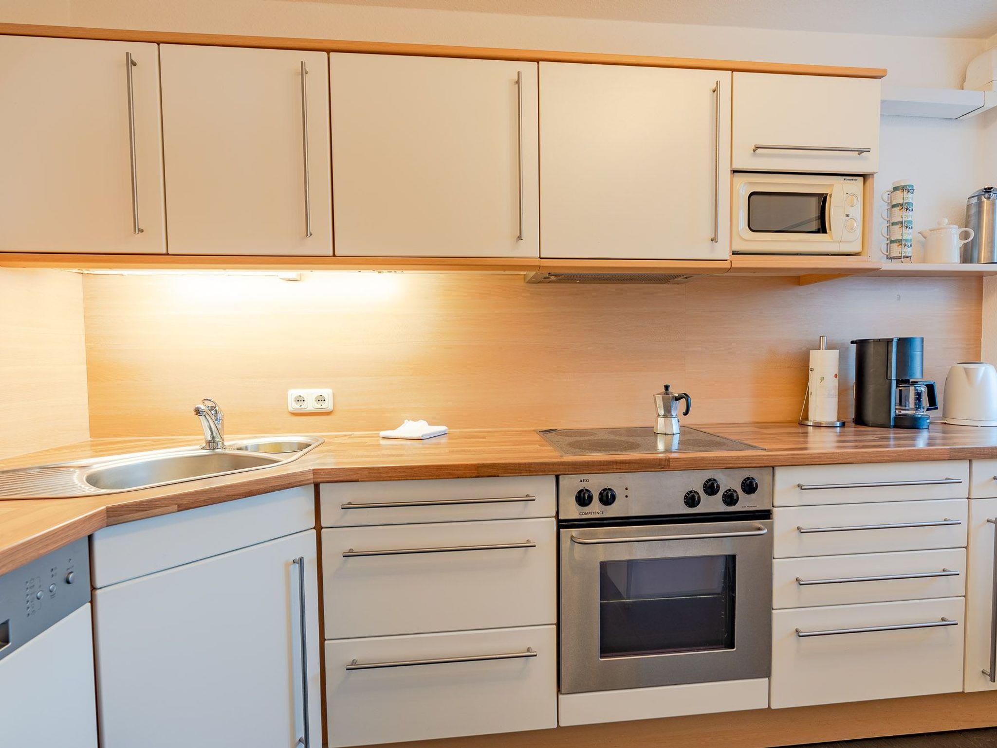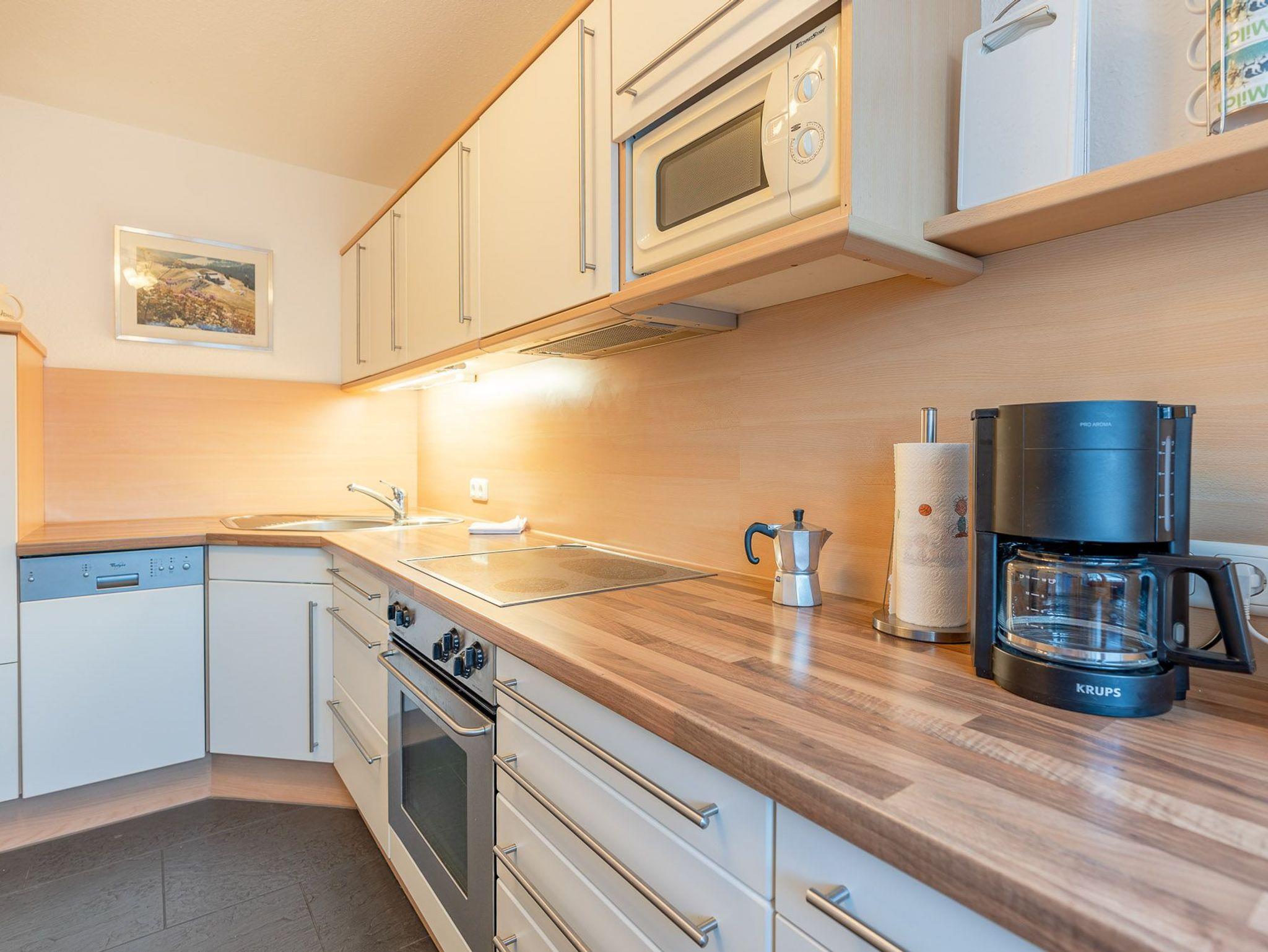 Die Wohnung verfügt über eine komfortable voll ausgestatteter Küche und einen großen hellen Wohnraum mit integrierter Essecke. Vom Wohnraum aus gelangen Sie auf die Terrasse mit Bergsicht.
