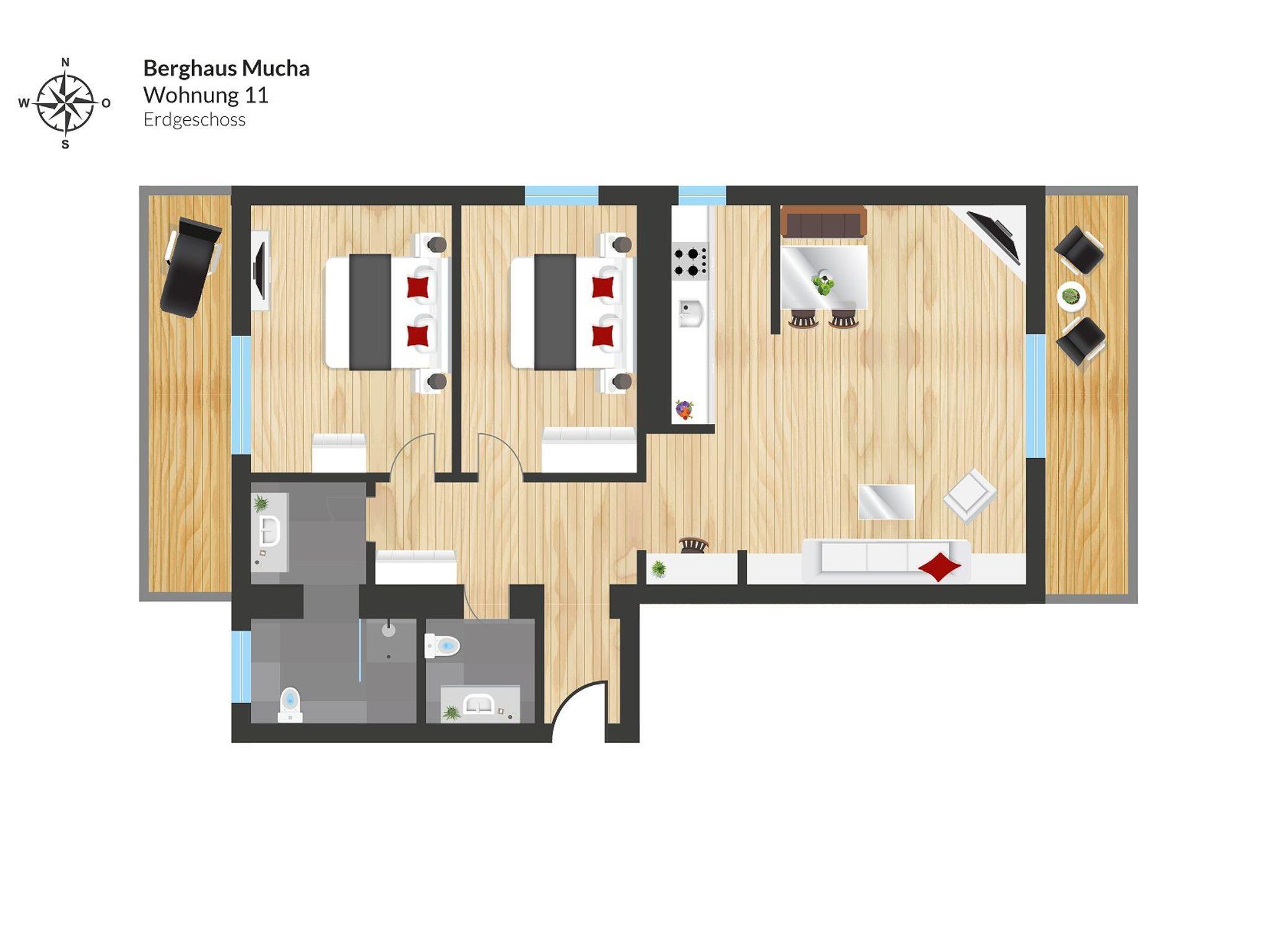 Die Wohnung im Erdgeschoss mit 75 m² verfügt über einen Wohnraum mit einer komplett ausgestatteten Küche, Esstisch, einer Sitzecke, Sat-TV, zwei Schlafzimmern, ein Ost- und ein Westbalkon, ein Bad mit Dusche und Toilette und eine seperate Toilette.