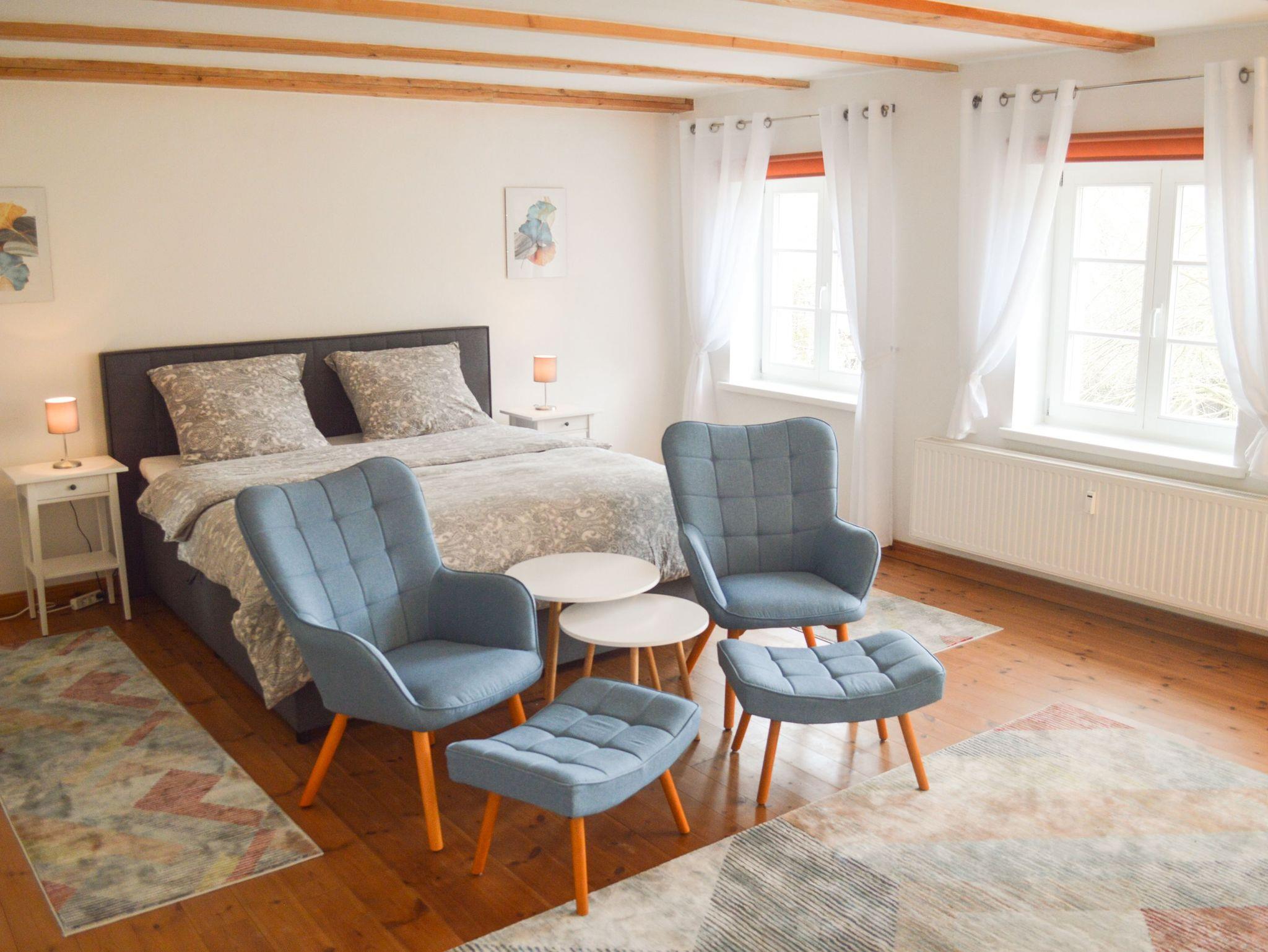 Die Ferienwohnung im Gutshaus Neu Necheln ist ein charmanter Erholungsort für bis zu 8 Personen. Auf 140 m² Wohnfläche könnt ihr gemeinsam einen entspannten Kurztrip oder einen ausgedehnten Urlaub an der mecklenburgische Seenplatte verbringen. Im Erdgeschoss erwartet euch der offene Essbereich mit anschließender Küche und Wohnzimmer. Von hier aus gelangt ihr direkt in den großzügigen eingezäunten Garten. Das Wohnzimmer verfügt über ein Schlafsofa (140x200) und einen TV. Die voll ausgestattete Küche empfängt euch mit allem, was ihr für einen entspannten Morgen oder gemütlichen Abend benötigt. Für euere köstlichen Mahlzeiten stehen euch ein Kühlschrank, Backofen, Induktionsherd und Küchenhelfer des täglichen Bedarfs zur Verfügung. Startet mit einem Kaffee aus dem Kaffeevollautomaten oder einem Tee in den Tag. Im Obergeschoss befinden sich 2 Schlafzimmer mit jeweils einem Doppelbett (180x200, 160x200) und einem Kleiderschrank, die für erholsame Nächte sorgen. Das Hauptschlafzimmer ist über einen Rundbogen mit Vorhang vom Flur aus erreichbar. Das 2. Schlafzimmer geht separat mit einer Tür vom Flur ab. Das Bad ist mit einer Badewanne, Dusche, Toplader und WC ausgestattet. Im Untergeschoss könnt ihr das 3. Schlafzimmer mit Doppelbett (140x200) nutzen, wenn ihr etwas mehr Platz braucht.