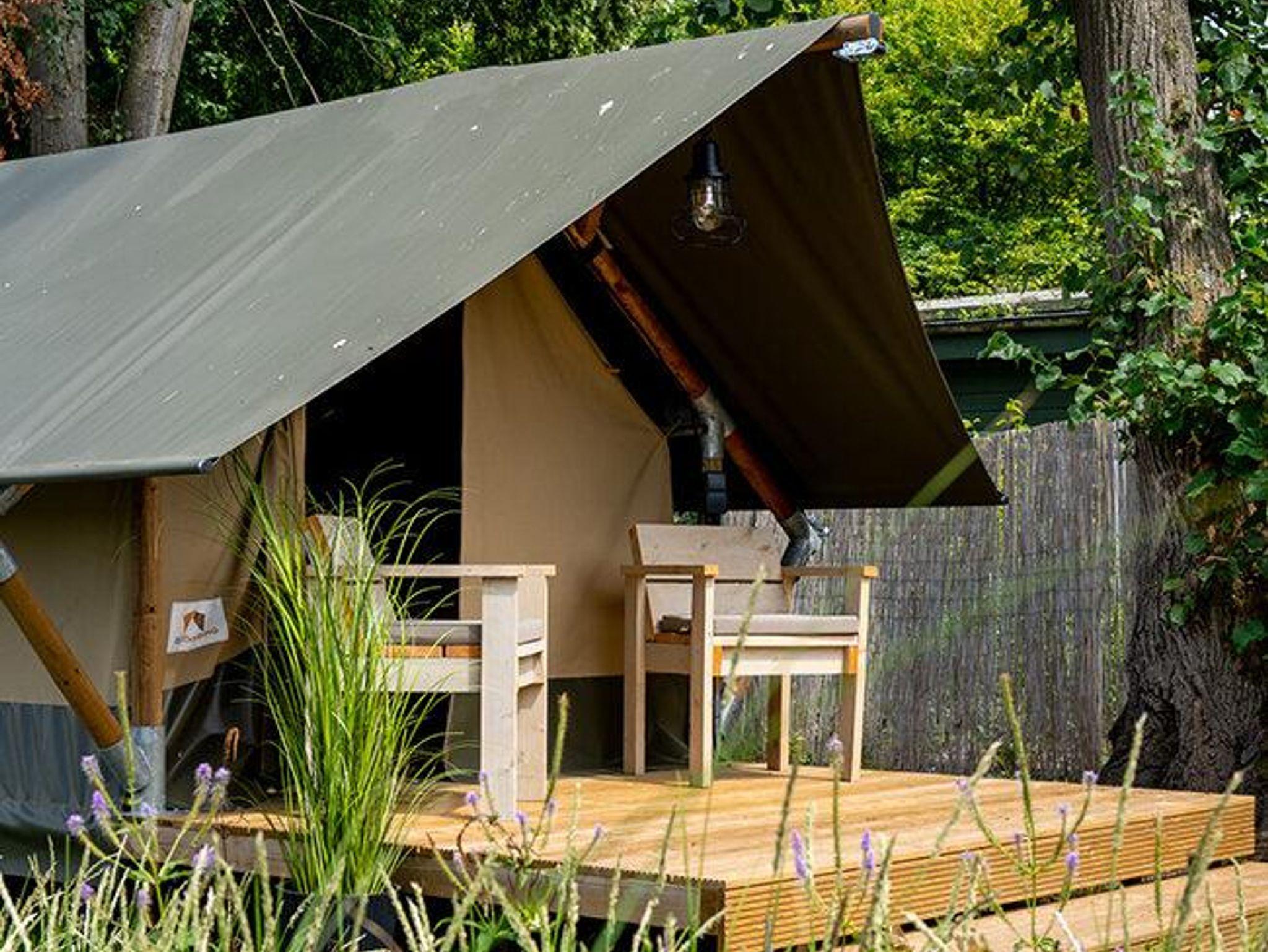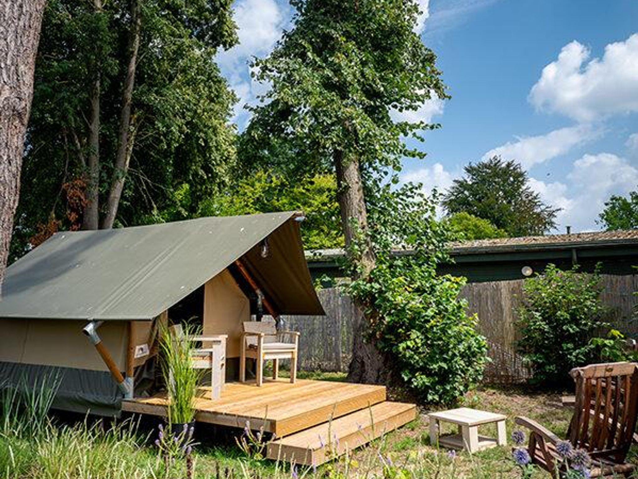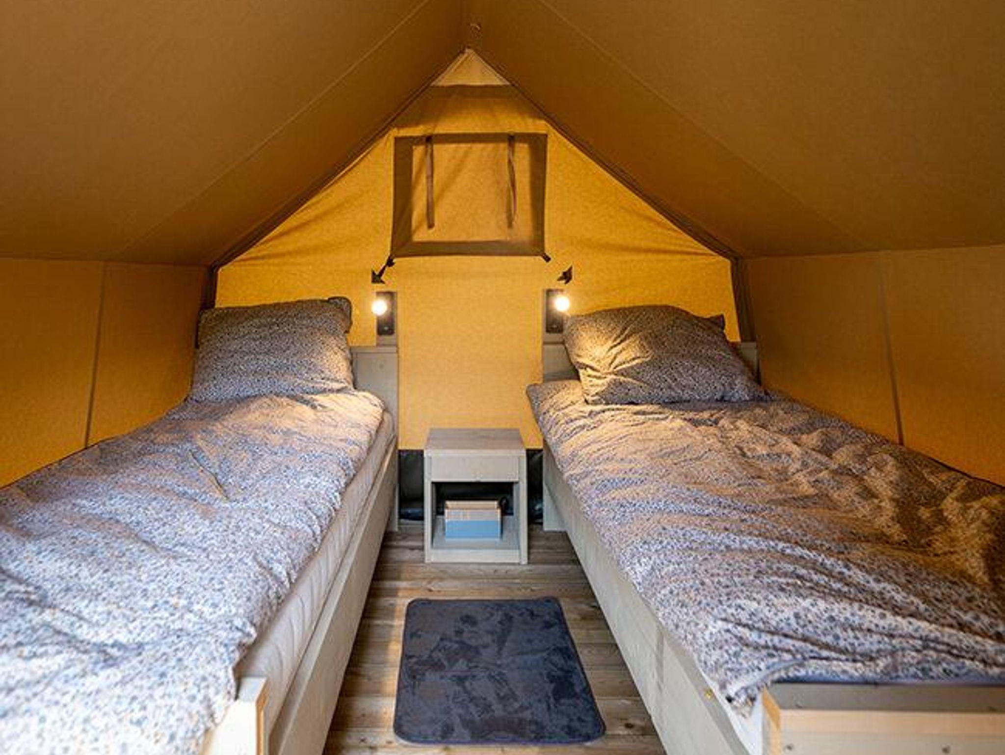 Zeltlodge mit Betten und Terrasse