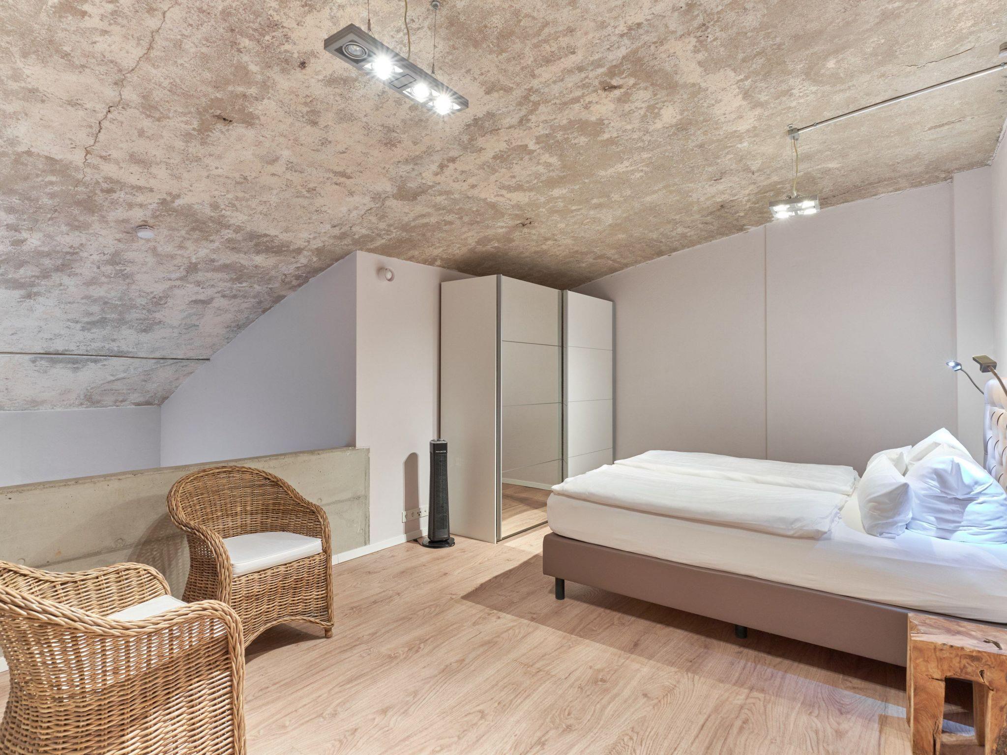 The maisonette apartment is on the upper floor of the former tannery and has a spacious and generous layout (66m²). The generously equipped apartment is suitable for 4 people. Children’s travel beds and highchairs can be booked in advance. The Italian sofas and armchairs in the living room invite you to relax. The big flatscreen TV with cable channels and a Blu-ray player provide ample entertainment. The stereo system with a Bluetooth connection allows you to enjoy your own music. Wi-Fi is available in the apartment. The living room directly adjoins the kitchen-diner with a fully-equipped kitchen (toaster also available on request) and a generous, solid wooden dining table, inviting you to enjoy culinary experiences. The two bedrooms on the lower level and the gallery are each furnished with an extra-long (210cm), high-quality, comfortable box spring bed.