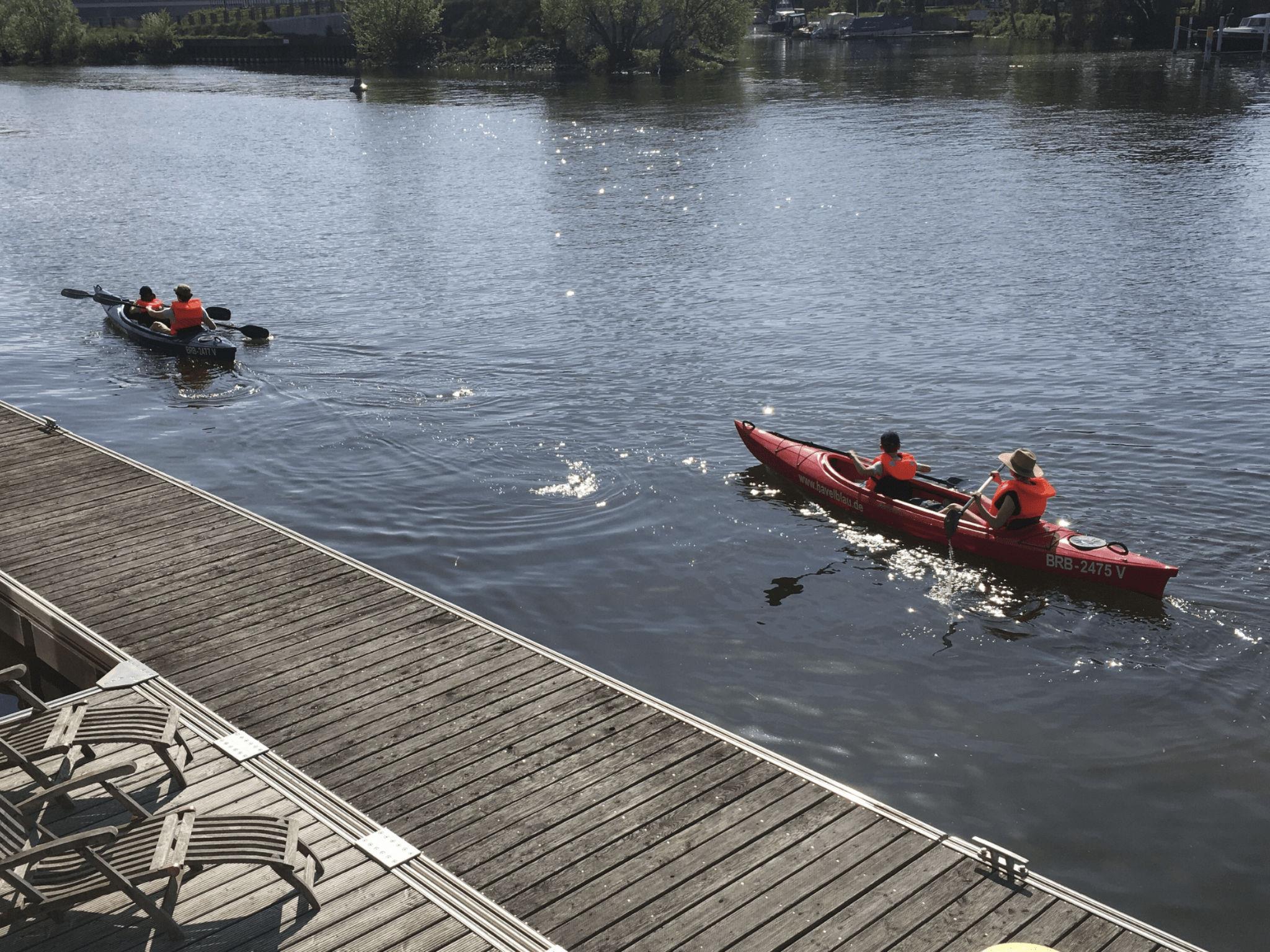 This apartment has an individual terrace area planted with hedges all around. The Bavarian rustic beer garden tables and chairs invite you to enjoy cosy hours in the fresh Havel air. This area is adjoined by a large lawn by the banks of the Havel with direct access to the house’s own swimming jetty with a ladder to facilitate getting in and out of the canoe or rowing boat. There is also a grill area there with a very large natural stone table (ca. 5 x 1.20m).