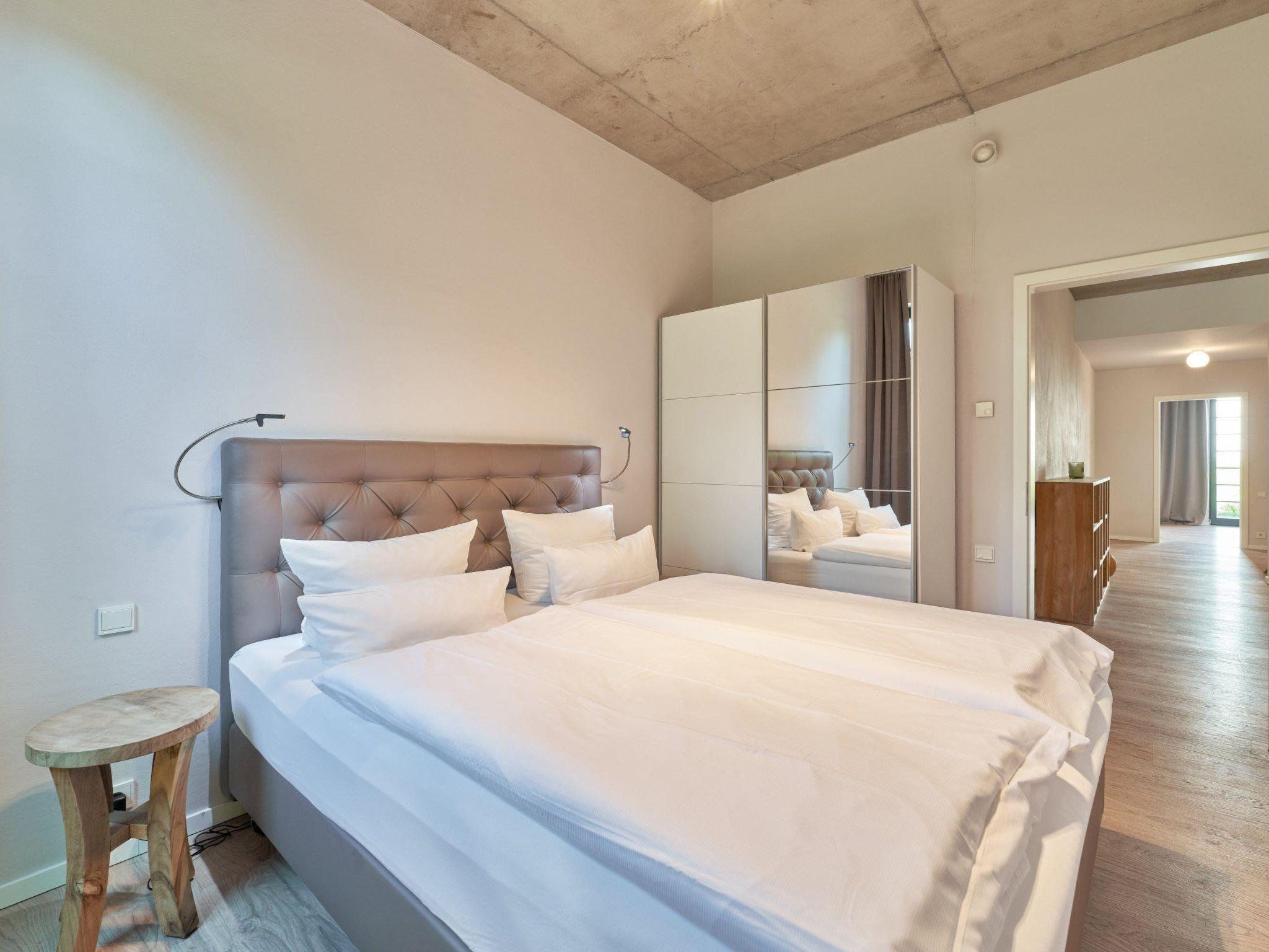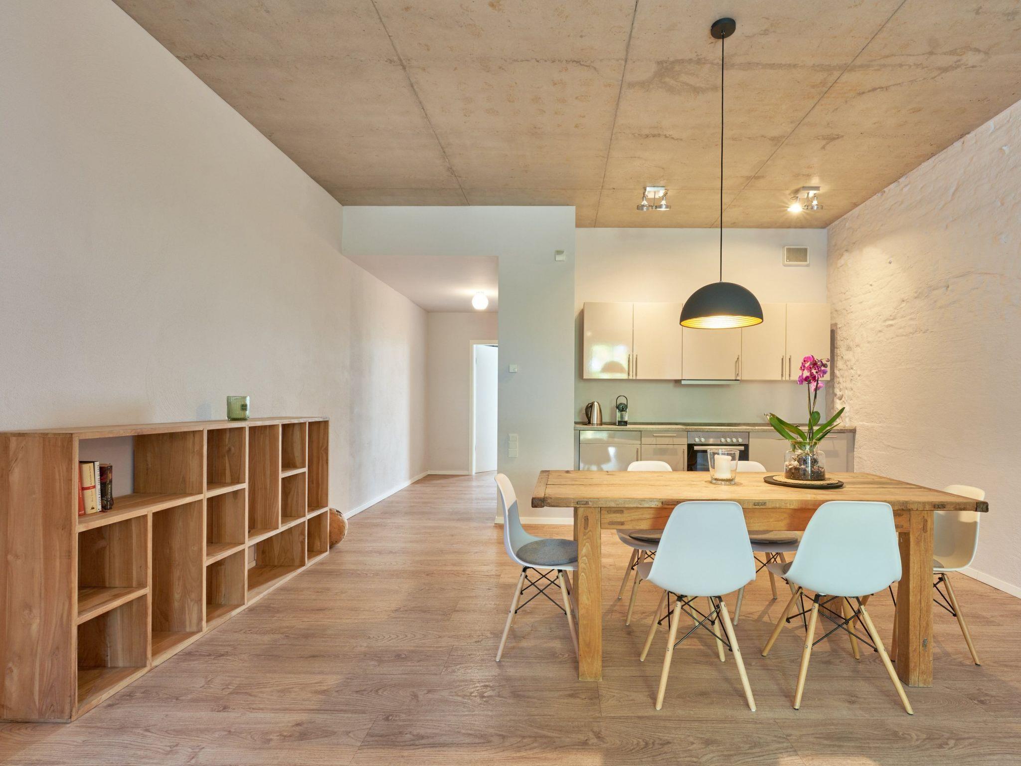 The apartment is on the ground floor of the former tannery and has a spacious and generous layout (86m²). It is barrier-free throughout with unrestricted wheelchair access. The generously equipped loft apartment is suitable for 4 people or with supplementary beds for 6 people. Children’s travel beds and highchairs can be booked in advance. The Italian sofas and armchairs in the living room invite you to relax. The large flatscreen TV with cable channels and a Blu-ray player provide ample entertainment. The stereo system with a Bluetooth connection allows you to enjoy your own music. This living room directly adjoins the kitchen-diner. The built-in kitchen is fully-equipped with a fridge and freezer, dishwasher, oven, ceramic hob and Nespresso coffee machine (basics provided). A toaster can be provided. The generous solid wooden dining table invites you to enjoy culinary experiences. The two very big adjacent bedrooms are furnished with an extra-long (210cm), high-quality, comfortable box spring bed. The walk-in shower in the bathroom also has a rain showerhead. The washbasin has a well-illuminated, large mirror and a wheelchair can fit underneath. Hand and shower towels are provided.