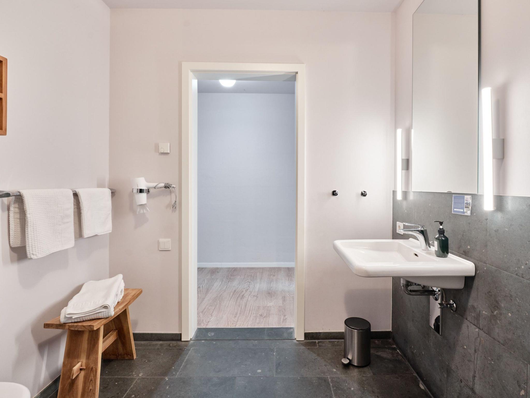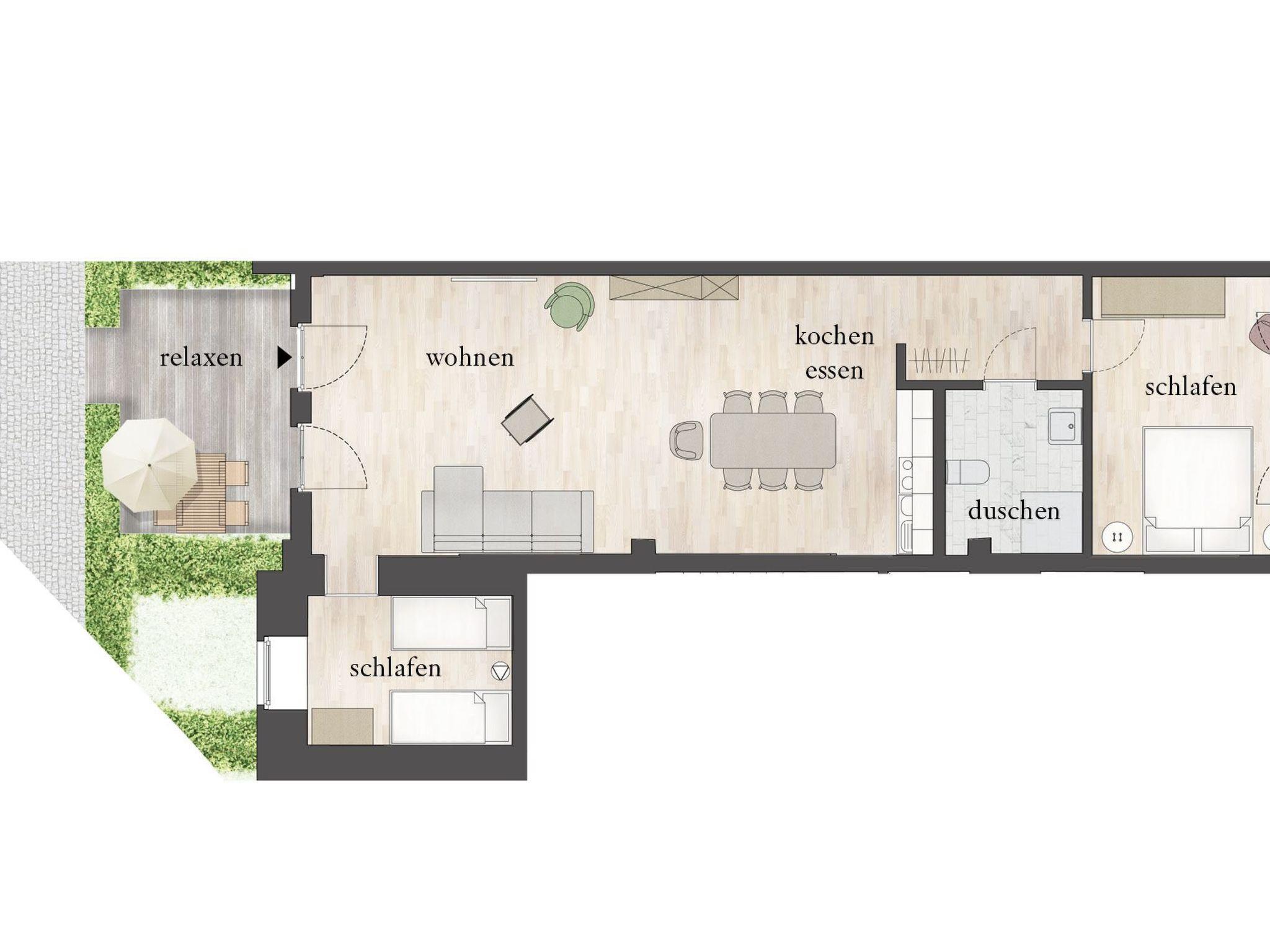 The holiday apartment is on the ground floor of the former tannery and has a spacious and generous layout (86m²). It is barrier-free throughout with unrestricted wheelchair access. The generously equipped apartment is suitable for 4 people or with supplementary beds for 6 people. Children’s travel beds and highchairs can be booked in advance. The Italian sofas and armchairs in the living room invite you to relax. The big flatscreen TV with cable channels and a Blu-ray player provide ample entertainment. The stereo system with a Bluetooth connection allows you to enjoy your own music. Wi-Fi is available in the apartment. The living room directly adjoins the kitchen-diner with a fully-equipped kitchen (toaster also available on request) and a generous, solid wooden dining table, inviting you to enjoy culinary experiences. One of the two bedrooms is furnished with an extra-long box spring bed (210cm).
