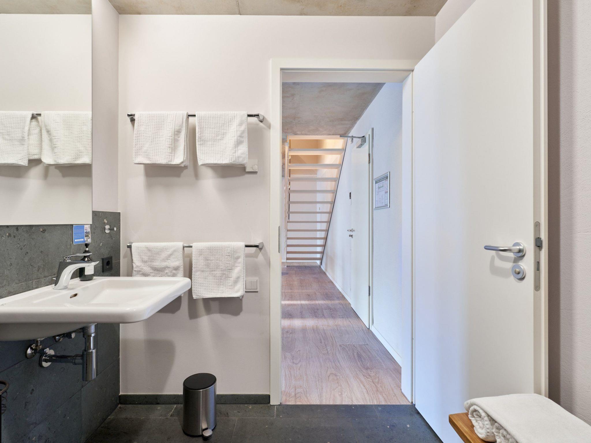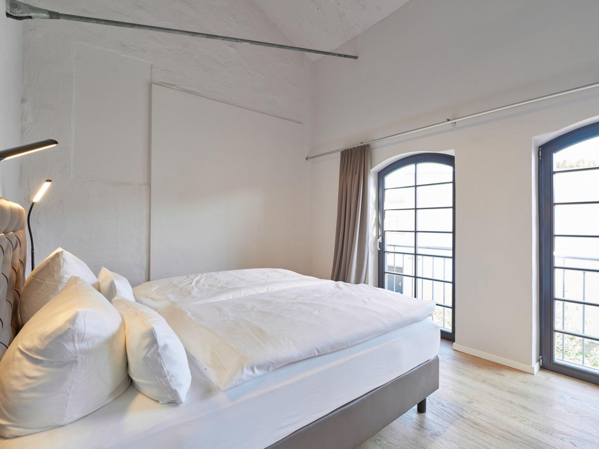 The maisonette apartment is on the upper floor of the former tannery and has a spacious layout (100m²). The generously equipped loft apartment is suitable for 4 people. Children’s travel beds and highchairs can be booked in advance. Italian sofas and armchairs in the living room invite you to relax. The big flatscreen TV with cable channels and a Blu-ray player provide ample entertainment. The stereo system has a Bluetooth connection for enjoying your own music. Wi-Fi is available in the apartment. This living room directly adjoins the kitchen-diner. The generous solid wooden dining table invites you to enjoy culinary experiences prepared in the fully-equipped kitchen. A toaster can also be provided. The two very big bedrooms are on the lower floor and the gallery, each with an extra-long (210cm), comfortable, high-quality box spring bed. The walk-in shower in the bathroom also has a rain showerhead. The washbasin has a large and well-illuminated mirror and wheelchairs can fit underneath. Hand and shower towels are provided.
