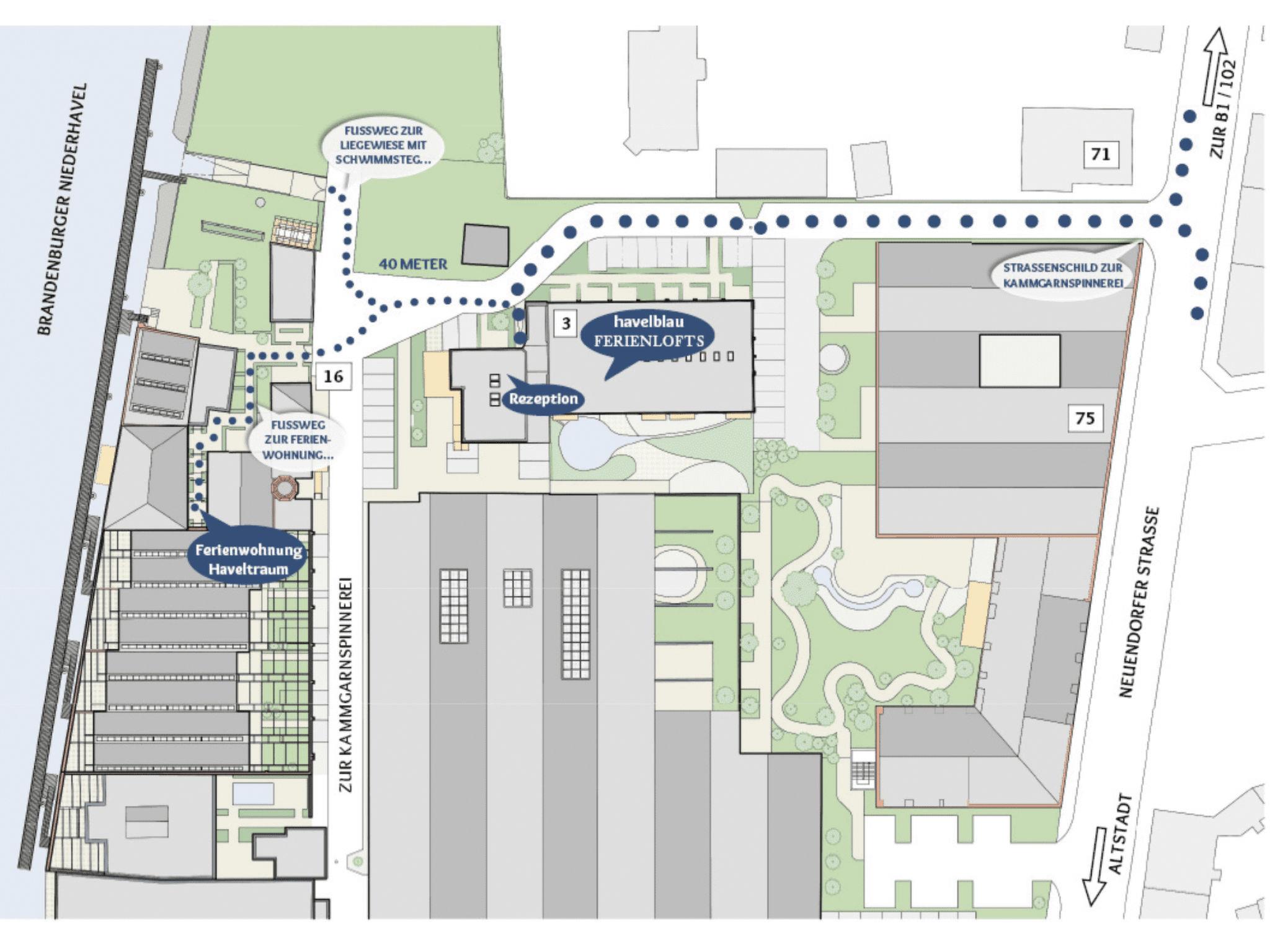 The 15 holiday lofts are situated on the edge of the Brandenburg old town, only 800 metres from the pedestrian zone. It is a few minutes on foot, by bike or by boat into the town centre, where you can stroll along the pedestrian zone, visit one of the many old churches such as the Brandenburger Dom, or visit the theatre. The many restaurants invite you to enjoy cosy evenings. For over 100 years, the finest wool and wool silk were produced on the site of the former worsted yarn spinning factory. Today you can enjoy life by the Havel here and relax. No matter whether you want to simply chill out in one of the two gardens, on the terrace or on the swimming jetty – here you can find peace and quiet right by the water, in the midst of town.
