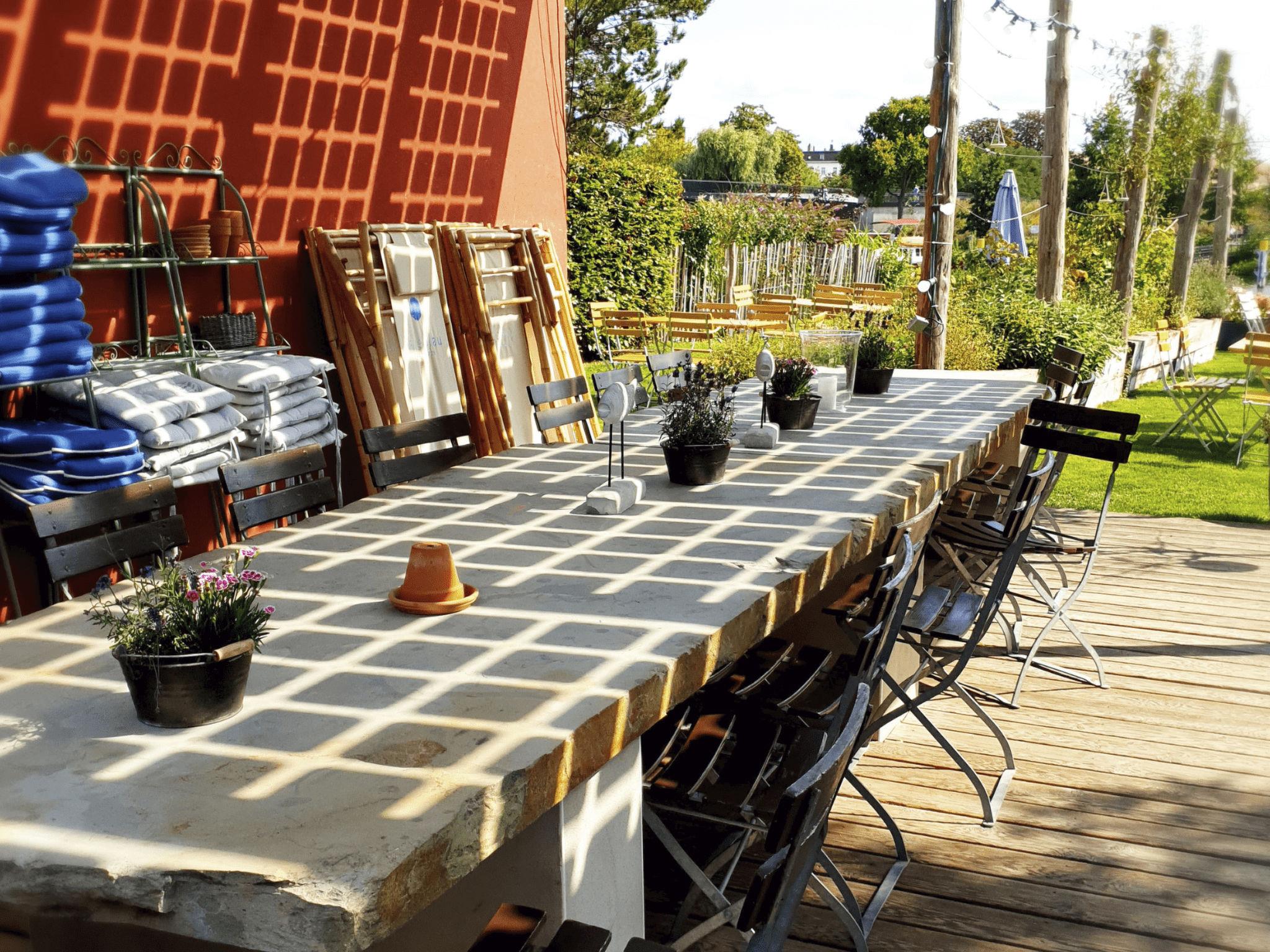 This apartment has an individual terrace area planted with hedges all around. The Bavarian rustic beer garden tables and chairs invite you to enjoy cosy hours in the fresh Havel air. This area is adjoined by a large lawn by the banks of the Havel with direct access to the house’s own swimming jetty with a ladder to facilitate getting in and out of the canoe or rowing boat. There is also a grill area there with a very large natural stone table (ca. 5 x 1.20m).