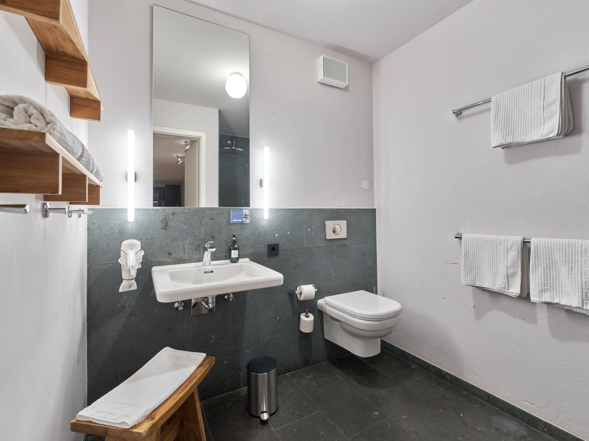 The holiday apartment is on the ground floor of the former tannery and has a spacious and generous layout (86m²). It is barrier-free throughout with unrestricted wheelchair access. The generously equipped apartment is suitable for 4 people or with supplementary beds for 6 people. Children’s travel beds and highchairs can be booked in advance. The Italian sofas and armchairs in the living room invite you to relax. The big flatscreen TV with cable channels and a Blu-ray player provide ample entertainment. The stereo system with a Bluetooth connection allows you to enjoy your own music. Wi-Fi is available in the apartment. The living room directly adjoins the kitchen-diner with a fully-equipped kitchen (toaster also available on request) and a generous, solid wooden dining table, inviting you to enjoy culinary experiences. One of the two bedrooms is furnished with a double box spring bed and the other with a single box spring bed.