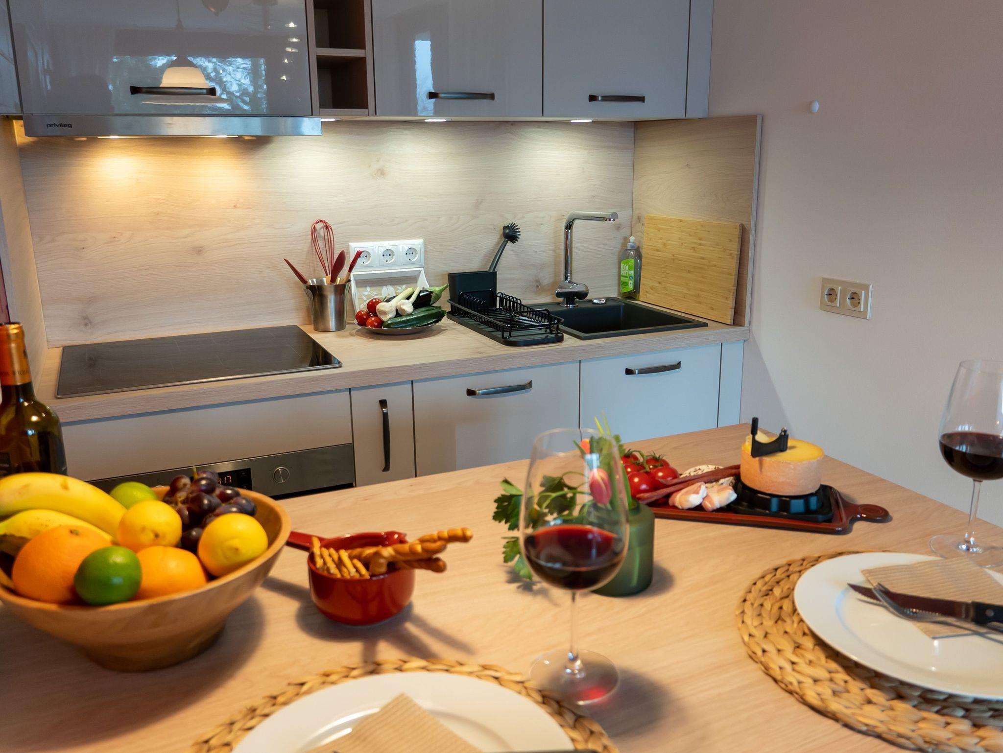 Im Anschluss vom Flur folgt das sehr helle Wohnzimmer mit der in den Raum integrierten Erkerfenster. Sie bieten durch den etwas angehobenen Fußboden einen herrlichen Weitblick auf die Berge, Wiesen und Wälder, Richtung Westen. Alle Möbel wurden im Jahr 2023 neu angeschafft. Im Wohnzimmer integriert befindet sich die neue Einbauküche mit einem Sitztresen und hochwertigen Barhockern.
