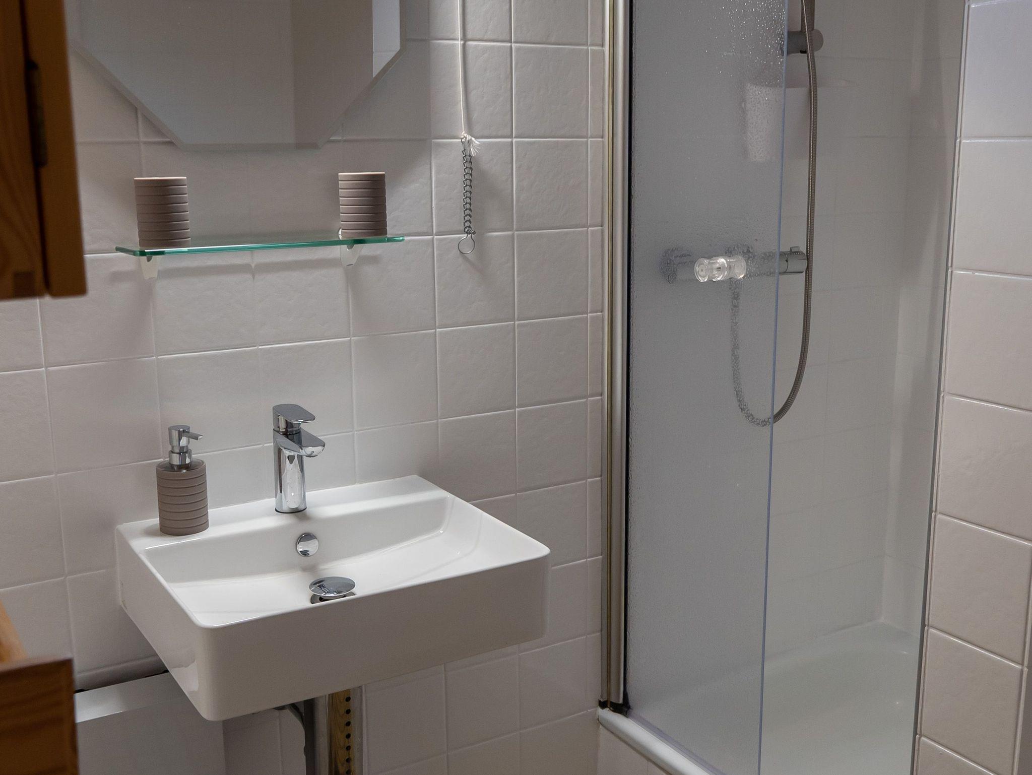 Sie betreten die FeWo über den Flur. Abgehend davon befindet sich ein kleiner Stauraum für Reinigungsutensilien und Staubsauger. Links abgehend vom Flur befindet sich das im Jahr 2023 teilsanierte Bad mit Dusche, WC und einer neu installierten großen Handtuchheizung.