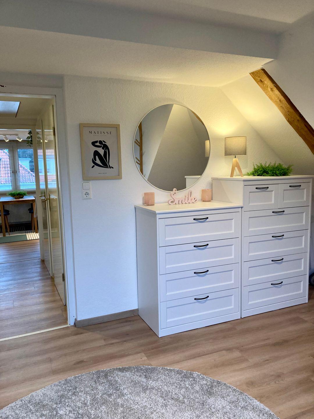 Im Schlafzimmer wartet ein bequemes Doppelbett auf Sie, das süße Träume garantiert. Eine Kommode, Garderobe und ein Ganzkörperspiegel sorgen dafür, dass Sie sich sofort wie zu Hause fühlen können.