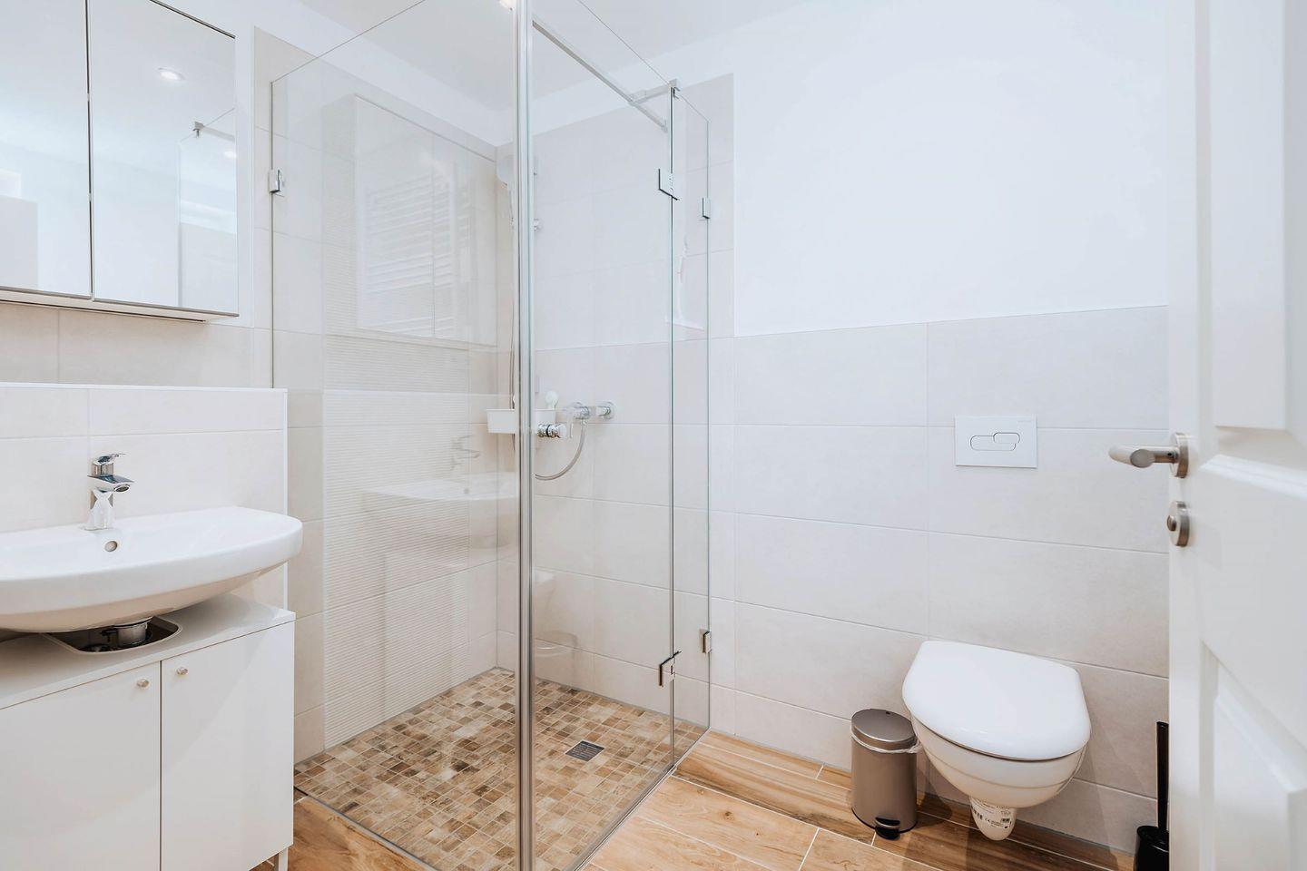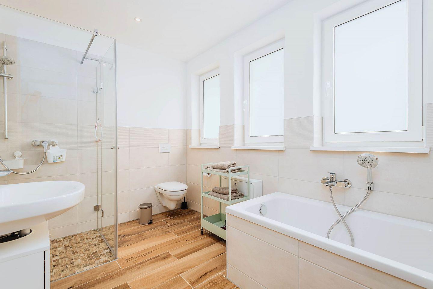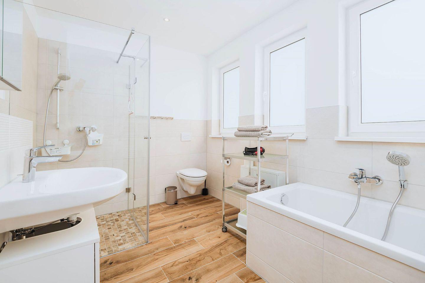 Ein Kinderreisebett und ein Hochstuhl stehen für die kleinsten Gäste zur Verfügung. Die zwei Bäder haben Fußbodenheizung und bodengleiche Duschen. Das obere Bad ist zusätzlich mit einer Badewanne ausgestattet.