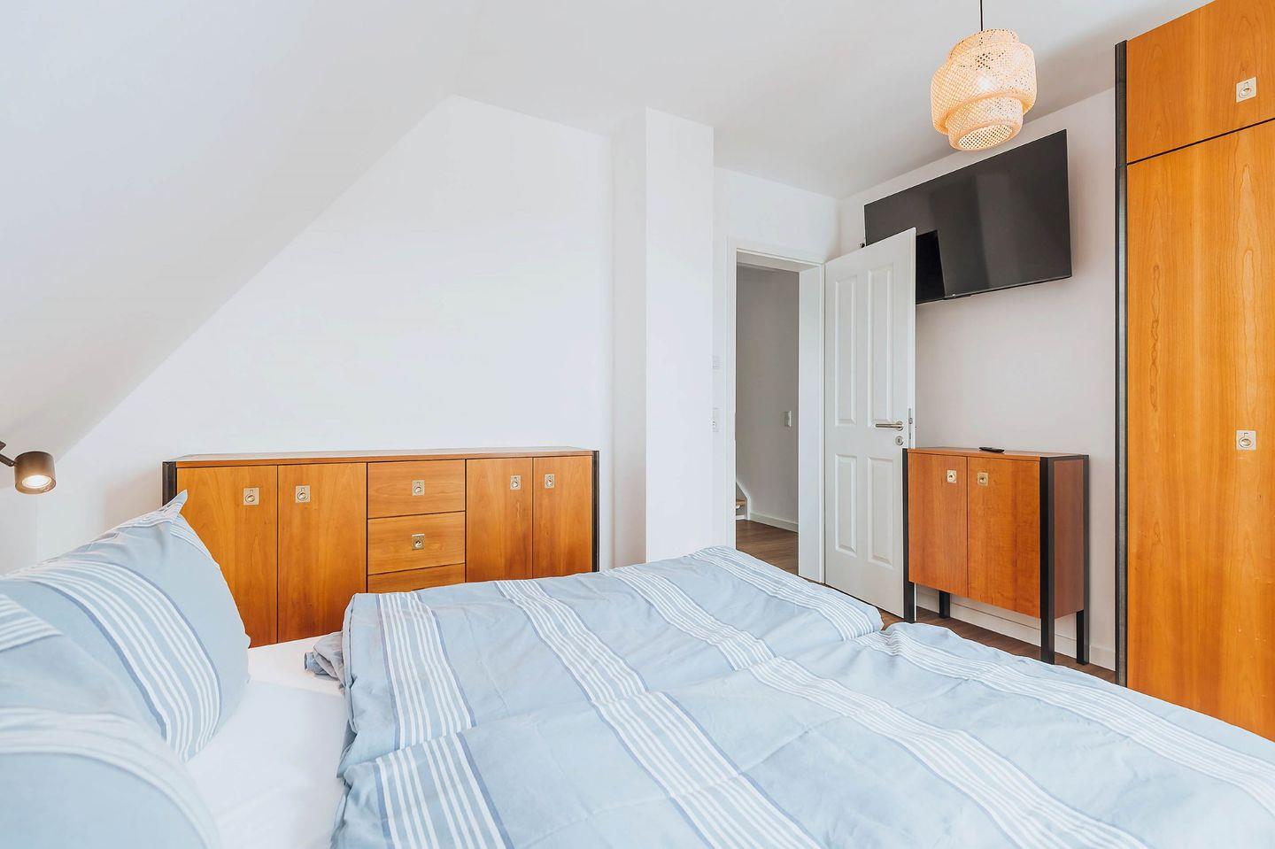 Der Bodden und eine Pferdekoppel sind in Sichtweite, der Strand von Zingst ist nur 5 Kilometer entfernt. Die modern eingerichtete und gut ausgestattete Doppelhaushälfte, Baujahr 2023, liegt direkt am Nationalpark Vorpommersche Boddenlandschaft. Das Herz des Hauses ist ein sehr großzügiger Wohnraum mit Essbereich und Leseecke, mit Sat-TV und einer komplett ausgestatteten Einbauküche. Von hier geht`s direkt auf die Terrasse mit Gartenmöbeln und Sonnenschirm. Drei von vier Schlafzimmer sind mit Flachbildfernseher ausgestattet. Ein Kinderreisebett und ein Hochstuhl stehen für die kleinsten Gäste zur Verfügung. Die zwei Bäder haben Fußbodenheizung und bodengleiche Duschen. Das obere Bad ist zusätzlich mit einer Badewanne ausgestattet. Zwei Schlafzimmer im ersten Stock haben Zugang zum großen Balkon mit Tisch und Stühlen. Weitere Annehmlichkeiten: kostenloses WLAN (ist in Bereitstellung und teilweise im Haus nutzbar) und Parkplätze am Haus. Für Räder steht ihnen ein abschließbarer Fahrradschuppen zur Verfügung. Das Doppelhaus in Bresewitz ist ein guter Ausgangspunkt für Spaziergänge und Fahrradtouren – auf den gut ausgebauten Radwegen sind Sie ruck, zuck am Strand von Zingst.