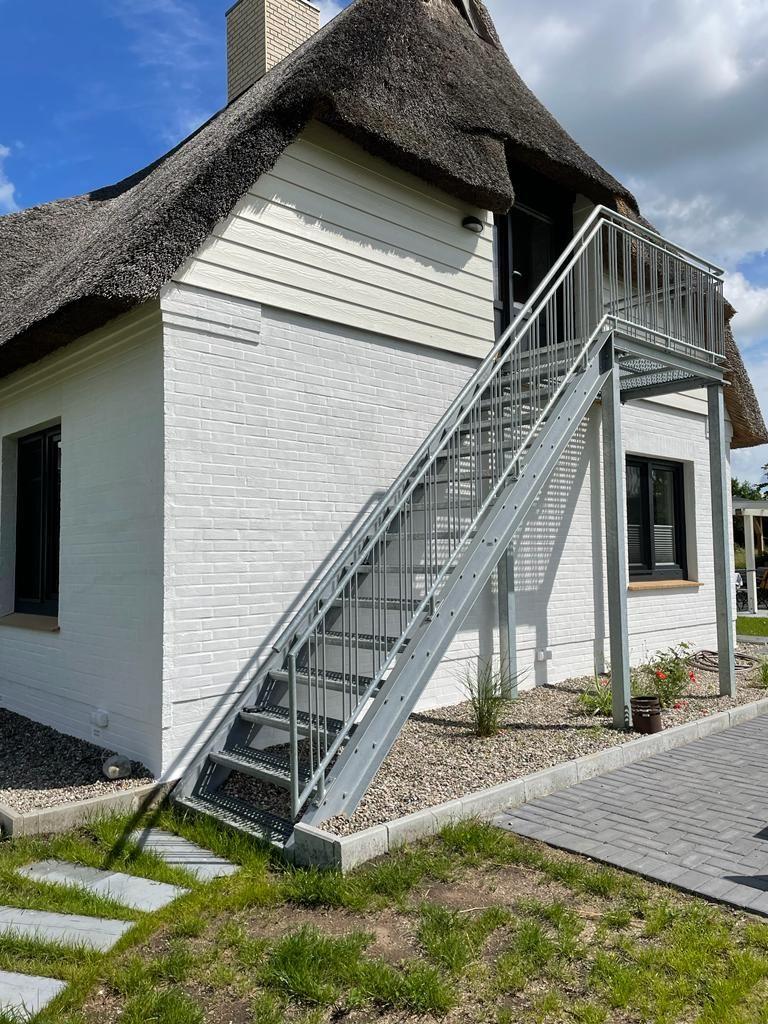 Der Zugang zur Wohnung erfolgt über eine Stahlgitter-Außentreppe (rechts am Haus)