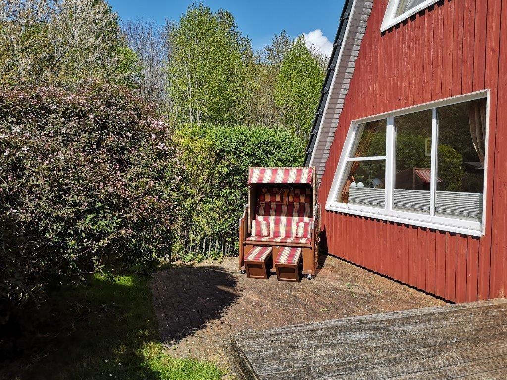 Das Ferienhaus ist ausgestattet mit gemütlichen Gartenmöbeln, einem Grill und einem Strandkorb.