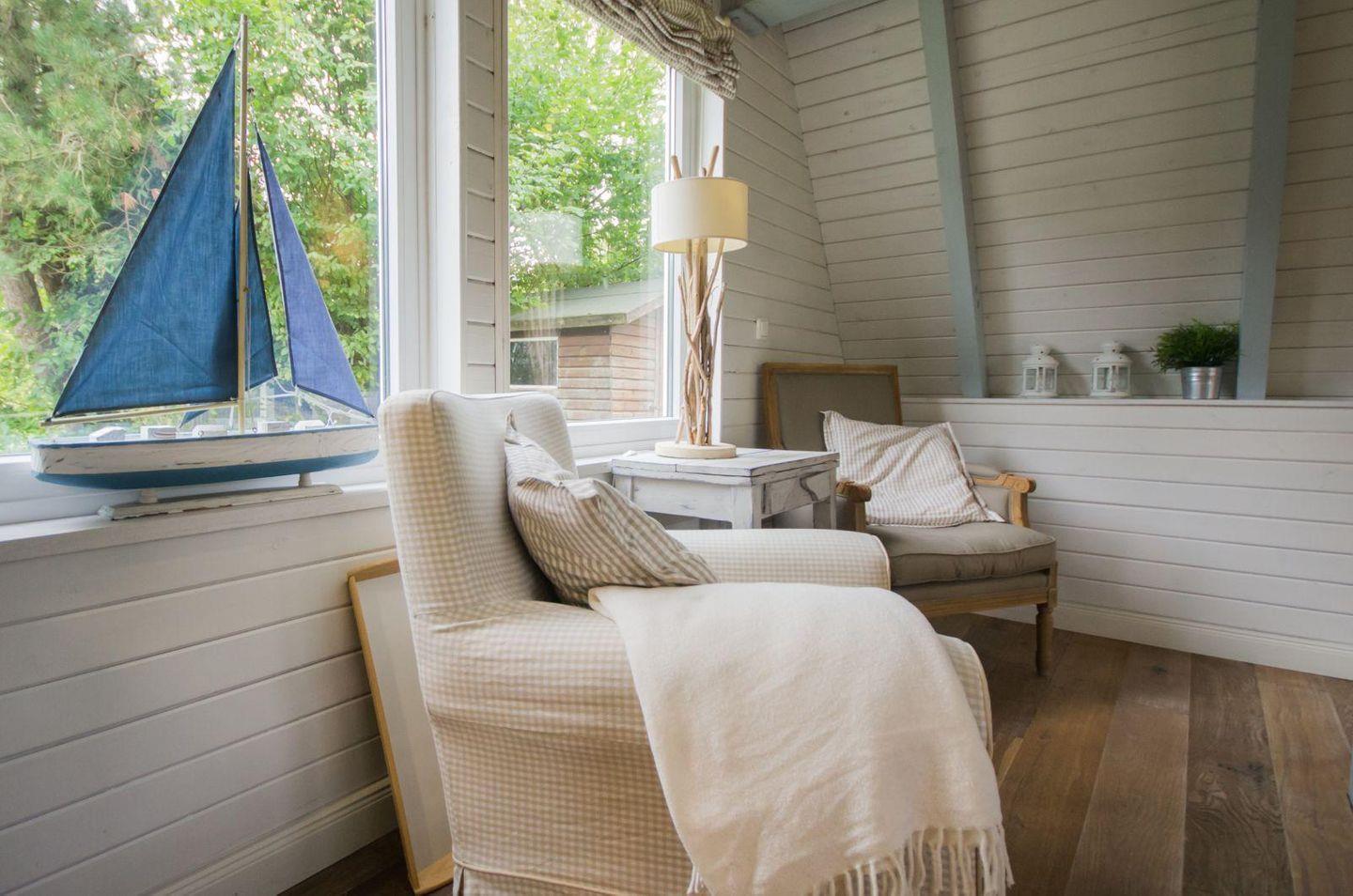 Das Domizil ist mit hochwertigen Möbeln, Fußböden und Gardinen ausgestattet. Liebevolle Details unterstützen den maritim-nordischen Charakter des Hauses.