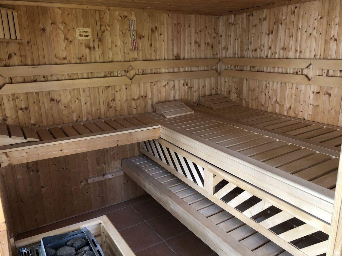 Das Saunahaus (18qm) mit einer Innen-und Außendusche verfügt über einen Ruheraum - hier können Sie perfekt entspannen. Die Krönung ist der große Außenwhirlpool für bis zu 6 Personen. (die Mindestbuchungsdauer beträgt für die Nutzung 7 Nächte; Sauna und Whirpool sind nicht im Preis inbegriffen und müssen extra vor Ort bezahlt werden! Sauna: 15€ pro Nacht, Reinigung Saunahaus 25€ einmalig, Pool 20€ pro Nacht)