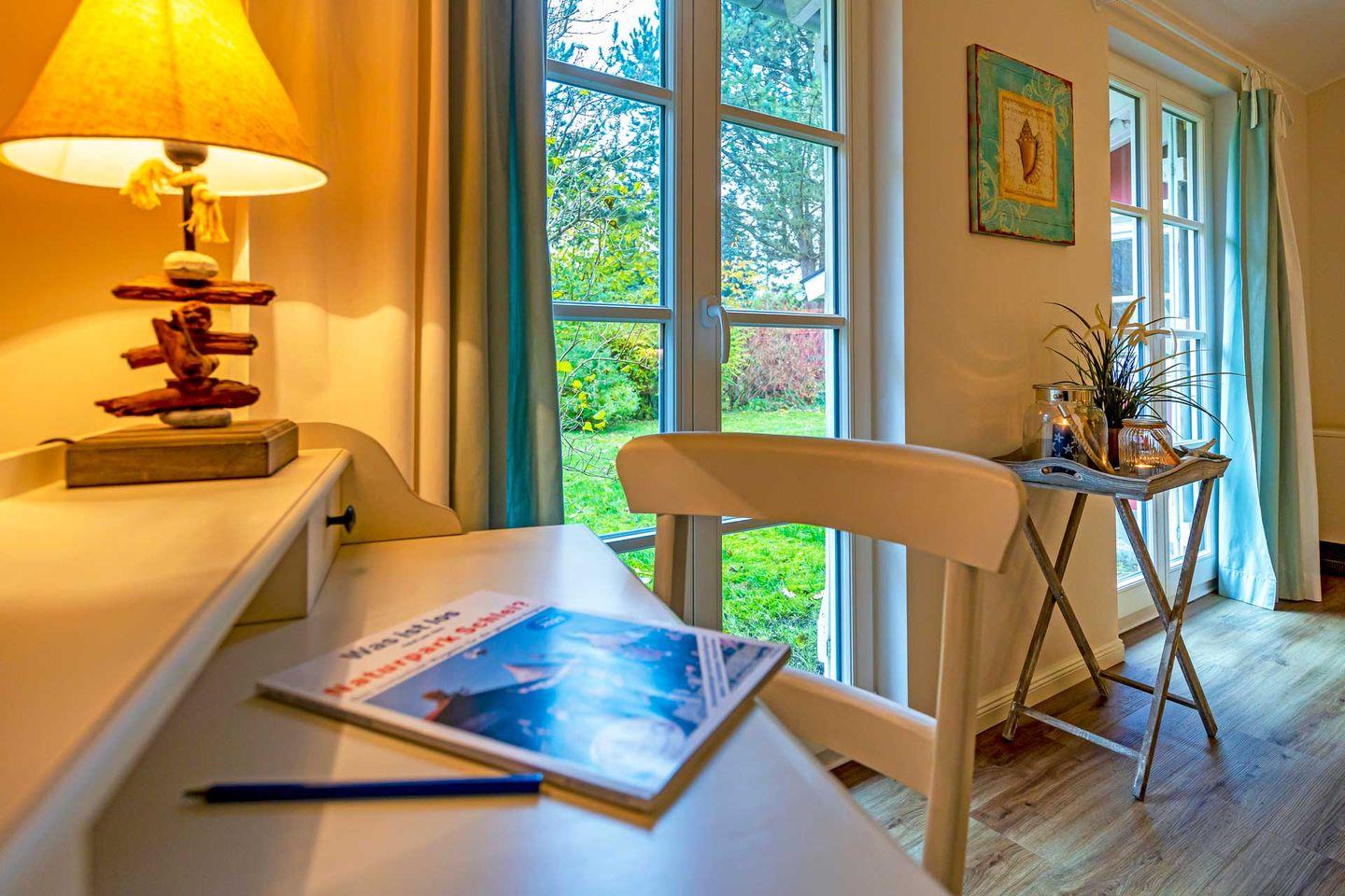 Eingerichtet im Sylter Strandhausstil werden Sie hier empfangen von lichtdurchfluteten hellen Räumen. Warme dezente Farbtöne in Verbindung mit maritimen Akzenten und einem gemütlichen Ofen sorgen hier für die perfekte Wohlfühlatmosphäre.