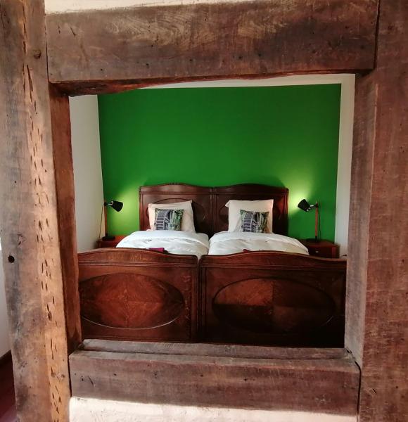 Großzügiges Doppelzimmer mit abgetrenntem Wohnbereich, Bad und Küche zur Mitbenutzung in einer historischen Wassermühle mitten in Niedersachsen. Schöner Garten mit Sitzmöglichkeiten am Mühlenteich. Baden im Mühlenteich möglich.
