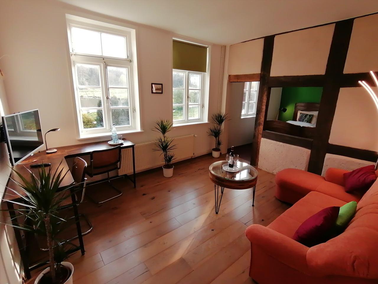 Gemütlich eingerichtetes Appartement im 1. Stock des historischen Mühlengebäudes mit Bad en Suite und Wohnzimmer mit zusätzlicher Schlafmöglichkeit (Schlafsofa), Arbeitsplatz, TV und WLAN.