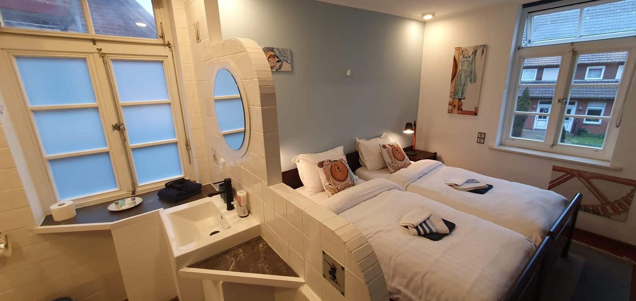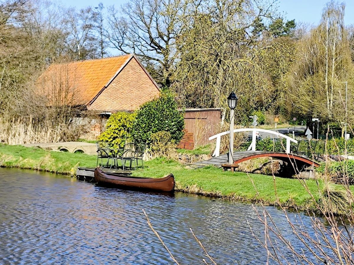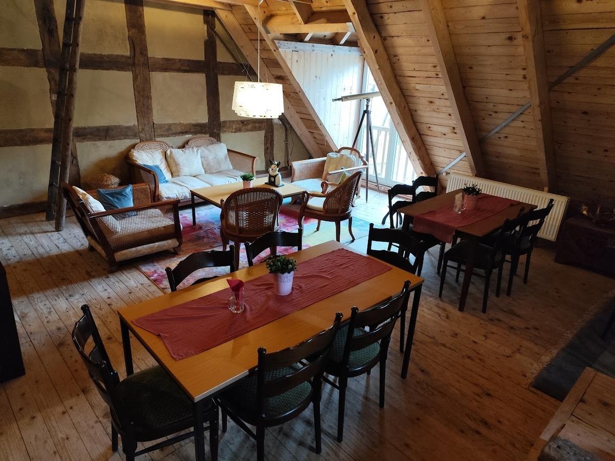 Großzügiges Doppelzimmer mit abgetrenntem Wohnbereich, Bad und Küche zur Mitbenutzung in einer historischen Wassermühle mitten in Niedersachsen. Schöner Garten mit Sitzmöglichkeiten am Mühlenteich. Baden im Mühlenteich möglich.