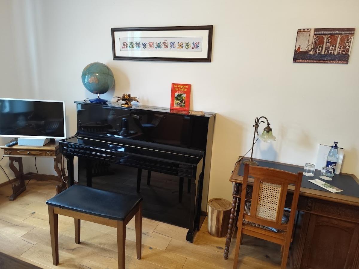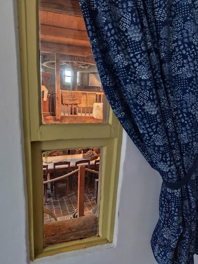 Gemütlich eingerichtetes Appartement im Erdgeschoss des historischen Mühlengebäudes mit Bad en Suite (barrierefrei), TV und WLAN. Ein kleines Fenster bietet einen Blick auf das historische Mahlwerk der Mühle.