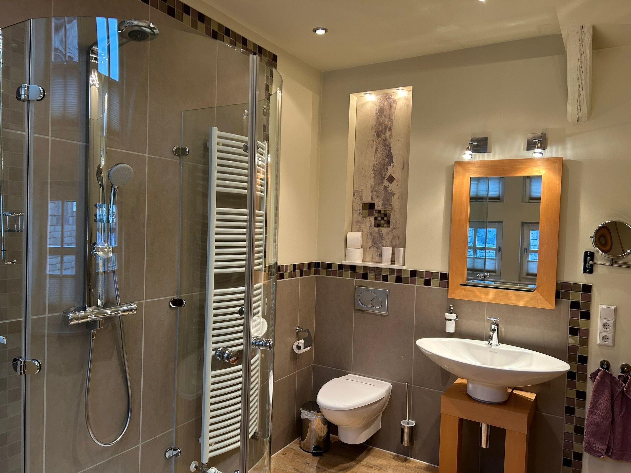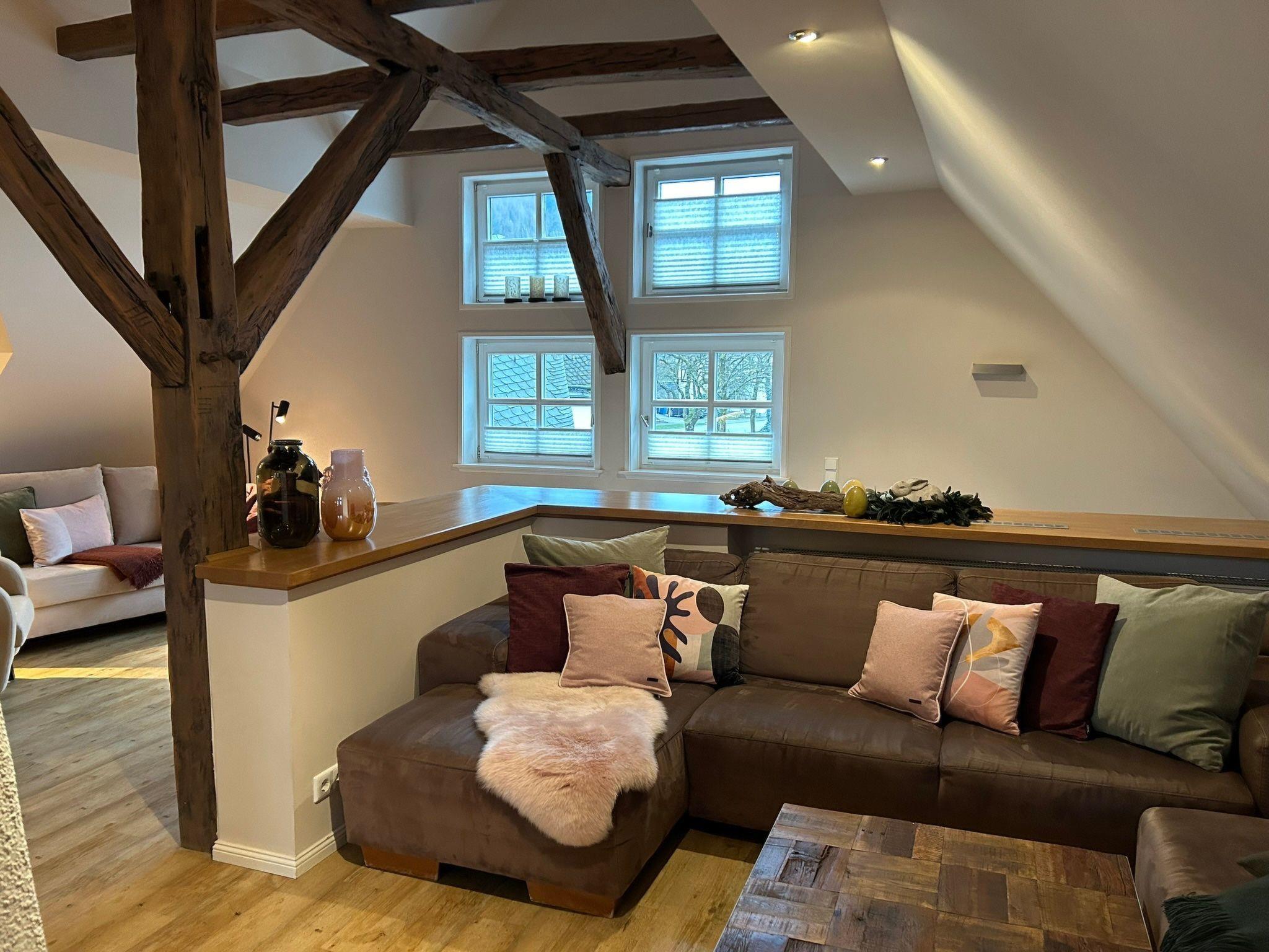 Experience the unique charm of our listed half-timbered house, which offers a seamless combination of historical beauty and modern luxury. A gem that promises its guests an incomparable atmosphere of historical flair paired with contemporary comfort. As you enter the house through the imposing 5-metre-high entrance hall, you are immediately captivated by the original half-timbered elements and the lovingly restored details that give this building its authentic character. These elements harmonise perfectly with the modern amenities that await you in every room. Enjoy the comfort and elegance of the interior design, which aims to make your stay as pleasant and inviting as possible.