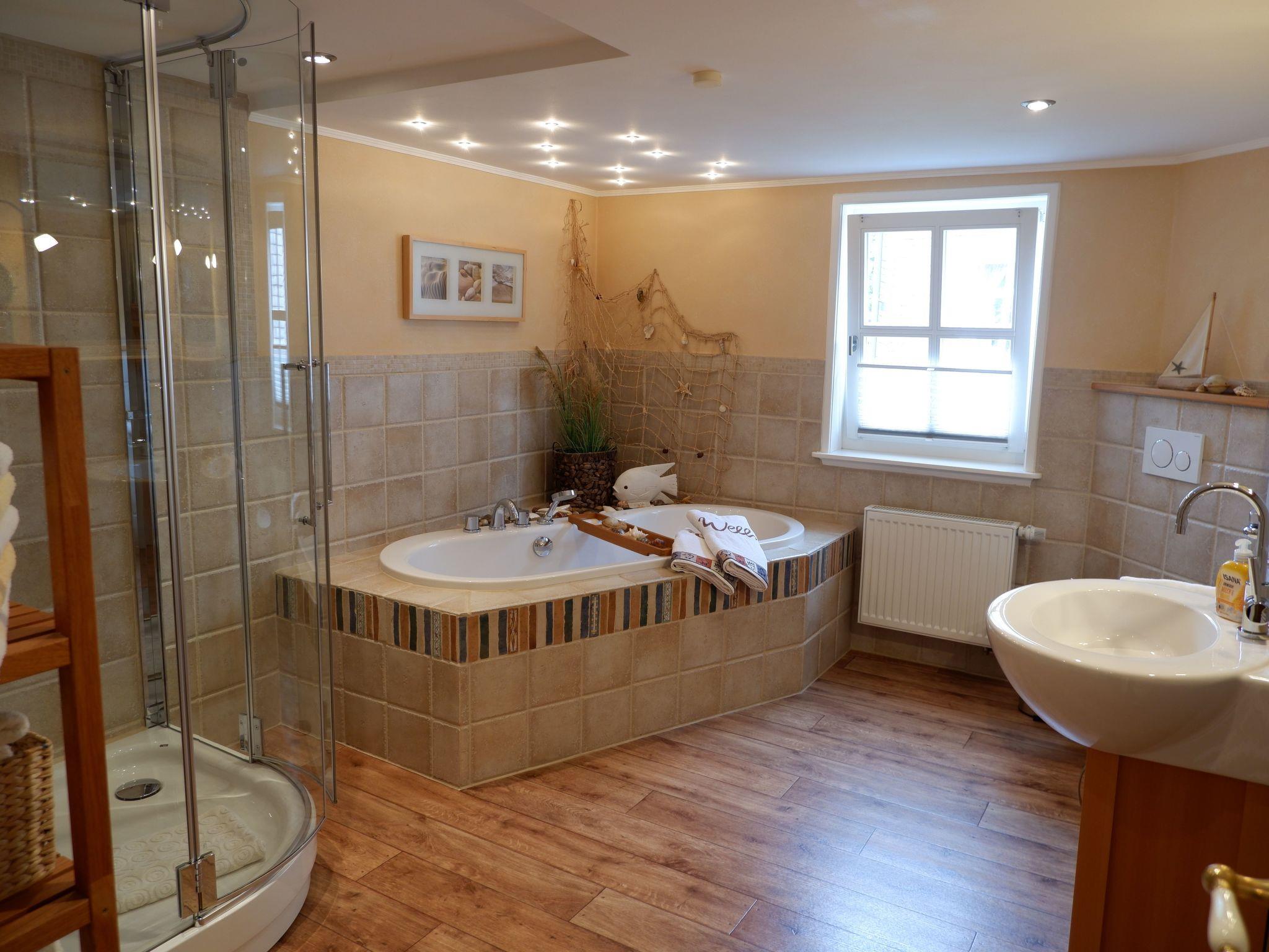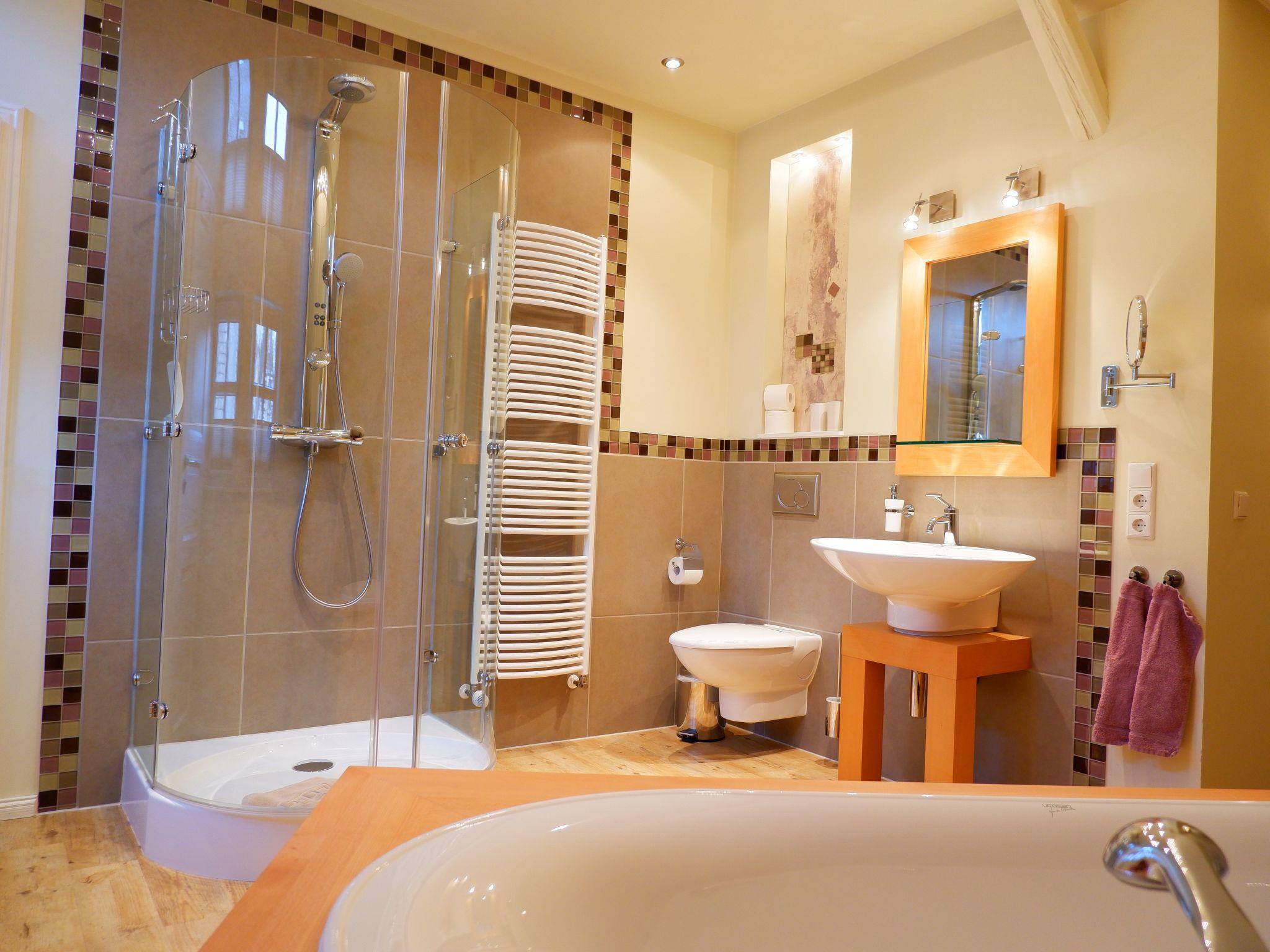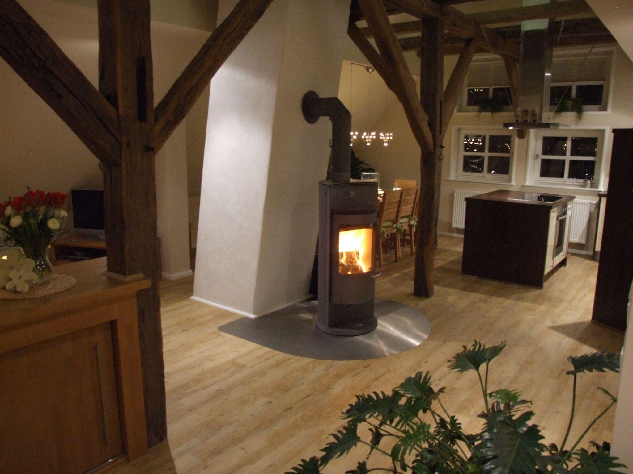 The interior of the holiday flat tastefully combines historical elements with the comfort you need for a carefree holiday. Each of the three complete flats offers a fully equipped kitchen and private bathrooms to ensure maximum privacy and comfort for all guests. There is also a washing machine and tumble dryer for your exclusive use. The central meeting point is the 5-metre-high lounge, which has a traditional fireplace for cosy hours.