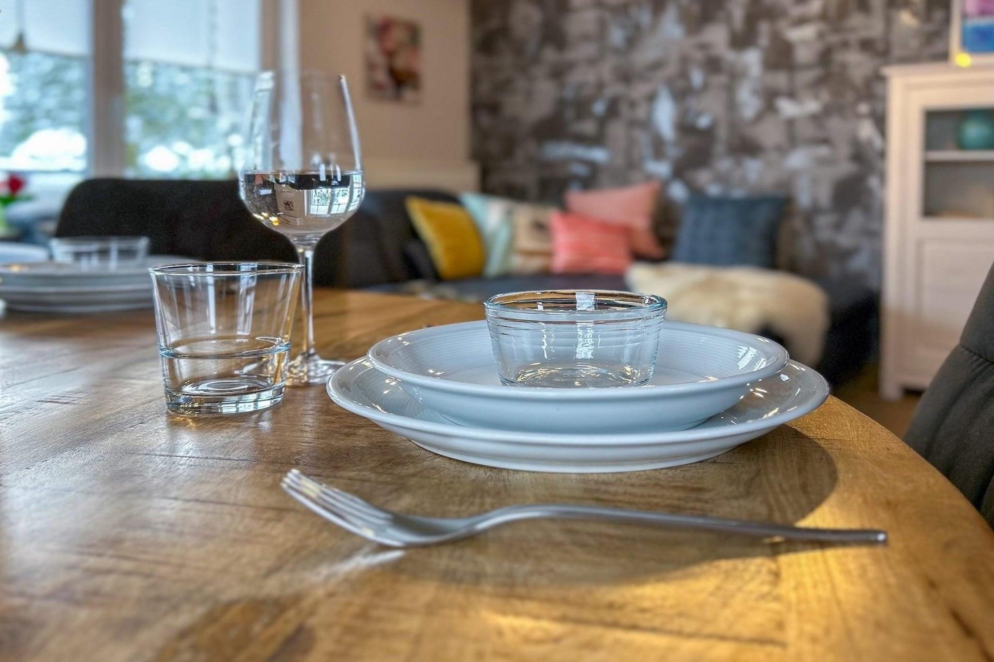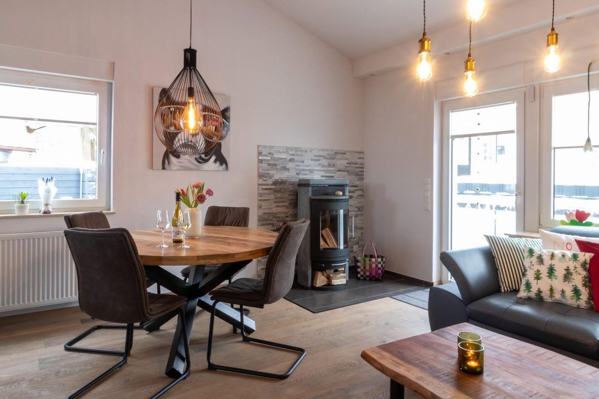 The heart of the vacation home (semi-detached house) is an open-plan first floor with a bright hallway. From there you enter the cozy living room with a large sofa bed, TV, USB radio and lovely fireplace. WLAN connection is available. Right next to it is the inviting dining area where you can take a seat at the round table. The adjoining kitchen is equipped with all the amenities you need for a perfect vacation. These include an induction hob, microwave, small but fine oven, dishwasher, fridge with freezer compartment, Senseo coffee machine plus additional cordless milk frother, kettle, toaster, hand mixer and kitchen scales. For the little ones there is baby and toddler crockery and a high chair. From the hallway, you can access the basement with its spacious sleeping area and generous bathroom. You can stretch out in a box-spring bed at night. There is also a television here. There is a wardrobe and chest of drawers for your clothes. The modern daylight bathroom is equipped with a large walk-in shower, washbasin, WC, towel radiator and rapid bathroom heater. The vacation home is surrounded by a fenced garden. From the first floor, you can access the partially covered terrace via a balcony equipped with seating and an awning. Garden furniture and a barbecue are available for you there. The vacation home is located on the outskirts of Bruchhausen, known for its "European Gold Village" award, the "Bruchhausen moated castle", the half-timbered houses in the village center and the "Bruchhauser Steine" natural monument. The village also offers a variety of activities nearby with the "Auf dem Sternrodt" ski area, a mountain toboggan run, the Rothaarsteig trail and the paragliding facility on the "Istenberg". The "Hillebachsee" leisure facility with a small bathing beach, water ski facility, play facilities and dog meadow can also be reached quickly by car. The popular excursion destinations of Winterberg and Willingen are also only around 20 minutes away by car. Nature, fun, relaxation or activity, here you have the best opportunities to make your vacation individual and varied.