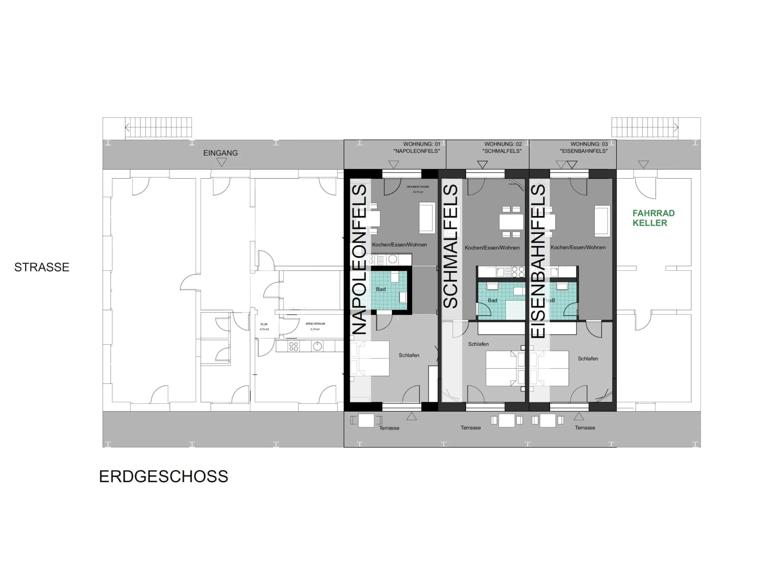 Drei barrierefreie Wohnungen befinden sich im Erdgeschoss, eine davon ist rollstuhlgerecht ausgestattet. Die sieben oberen Wohnungen bieten Balkone mit Blick ins Grüne, die unteren Terrassen mit Zugang ins Freie. Alle Apartments haben einen separaten Eingang – für maximale Privatsphäre und ein ruhiges Ankommen.