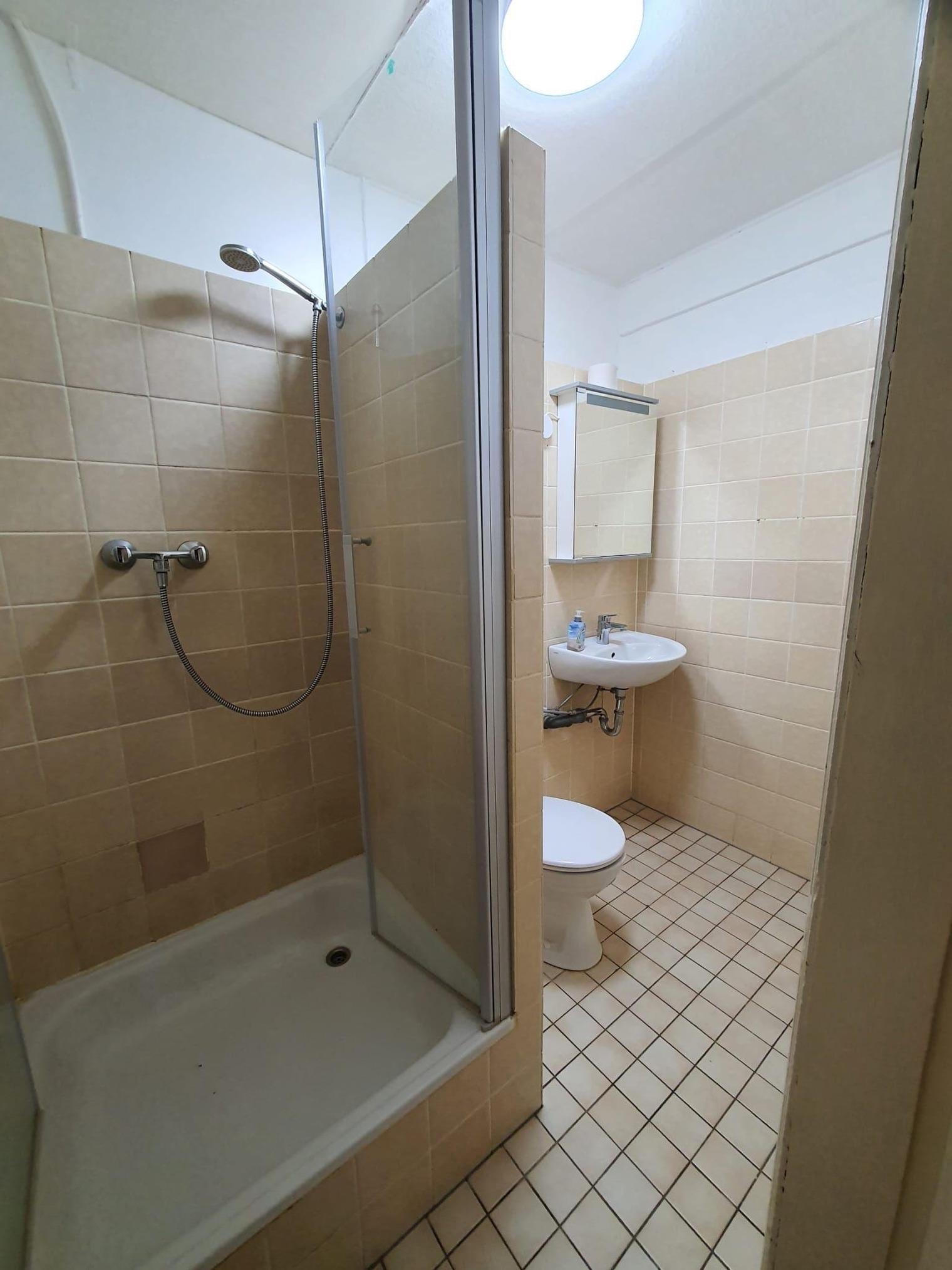 Das Badezimmer ist mit einer Dusche, WC, einem Badschrank ausgestattet.