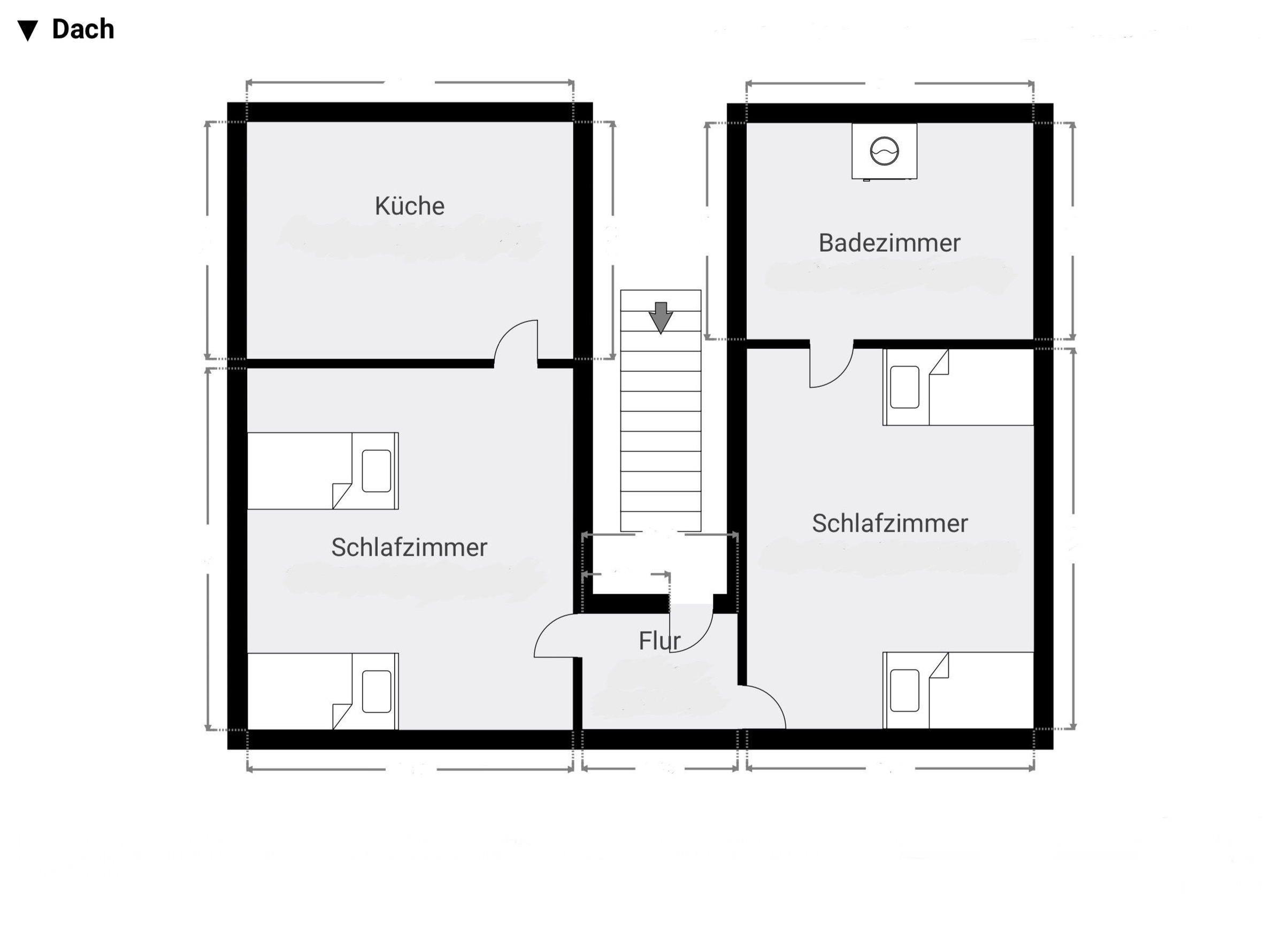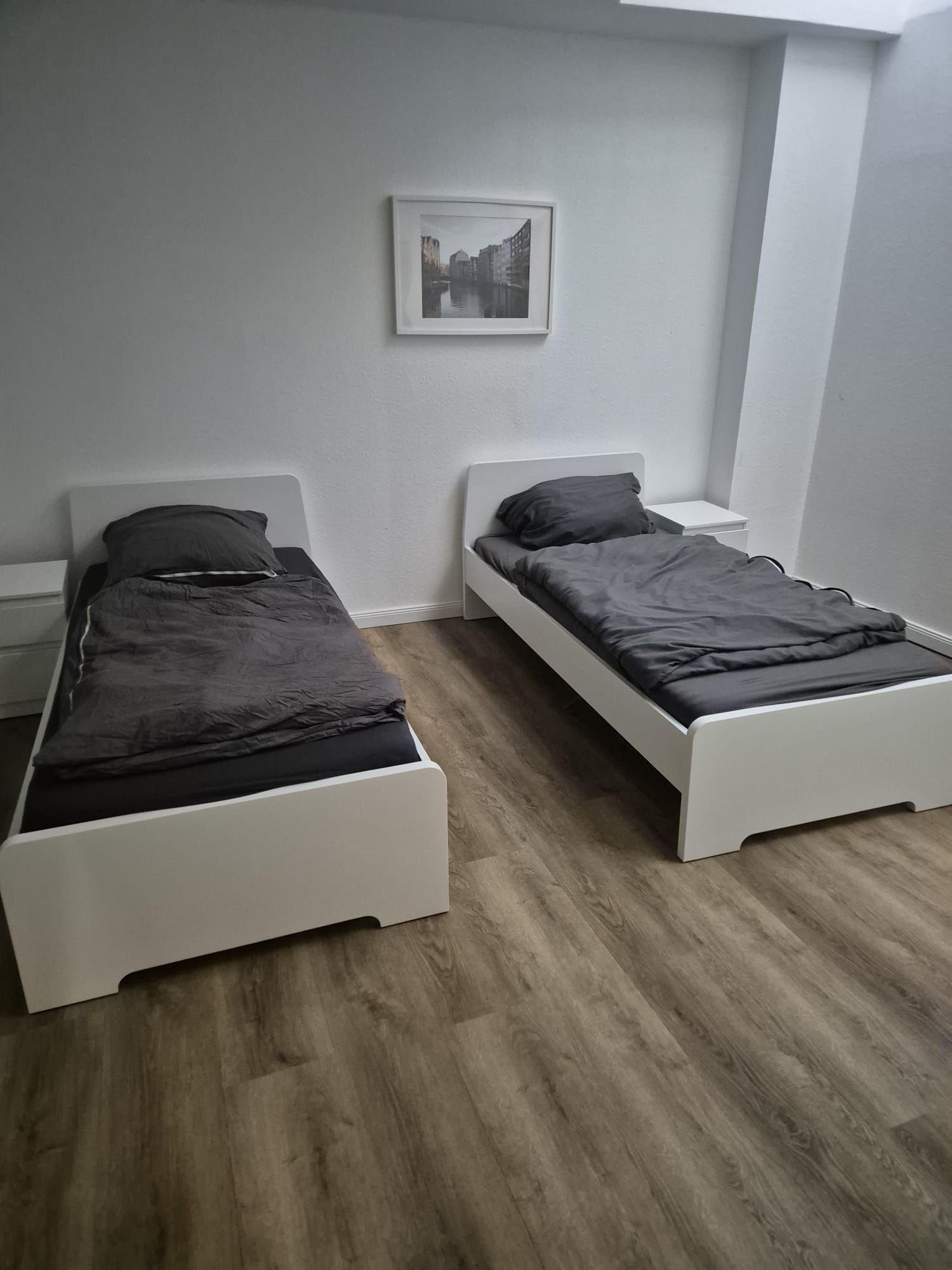 Die Wohnung im Dachgeschoss hat 2 Zimmer und ist mit 4 getrennt stehenden Einzelbetten, Kleiderschränken, Stühlen und Tisch, W-Lan sowie TV eingerichtet.