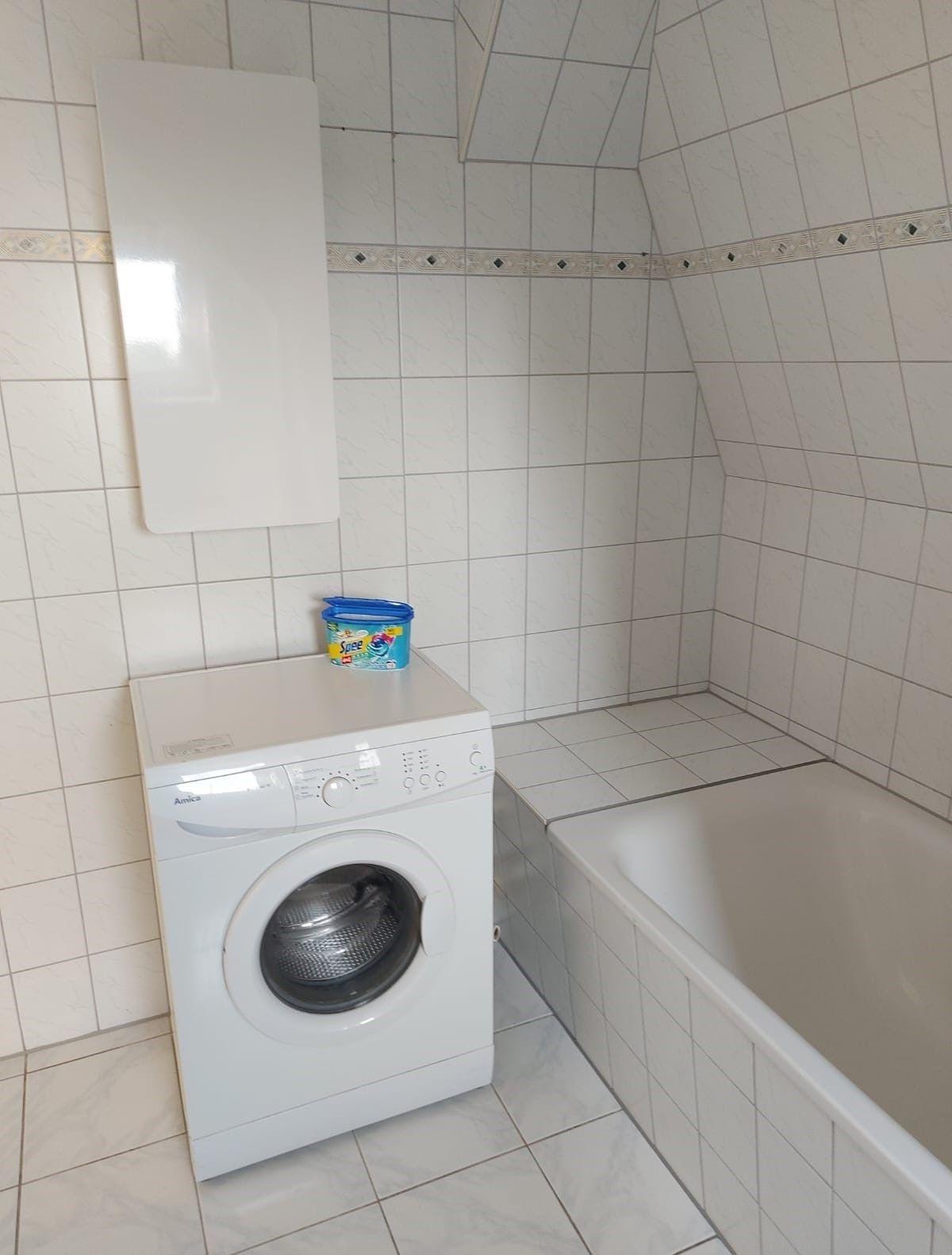 Das Badezimmer ist mit einer Badewanne, einem Badschrank, Waschmaschine sowie einem Wäscheständer ausgestattet.