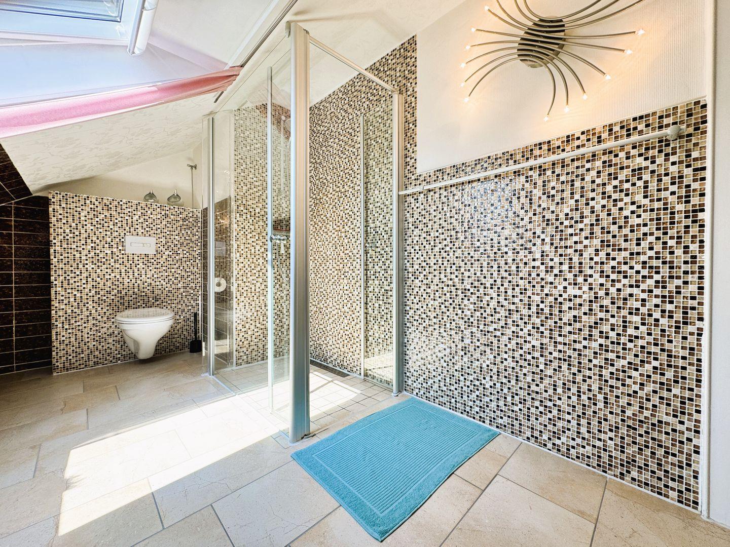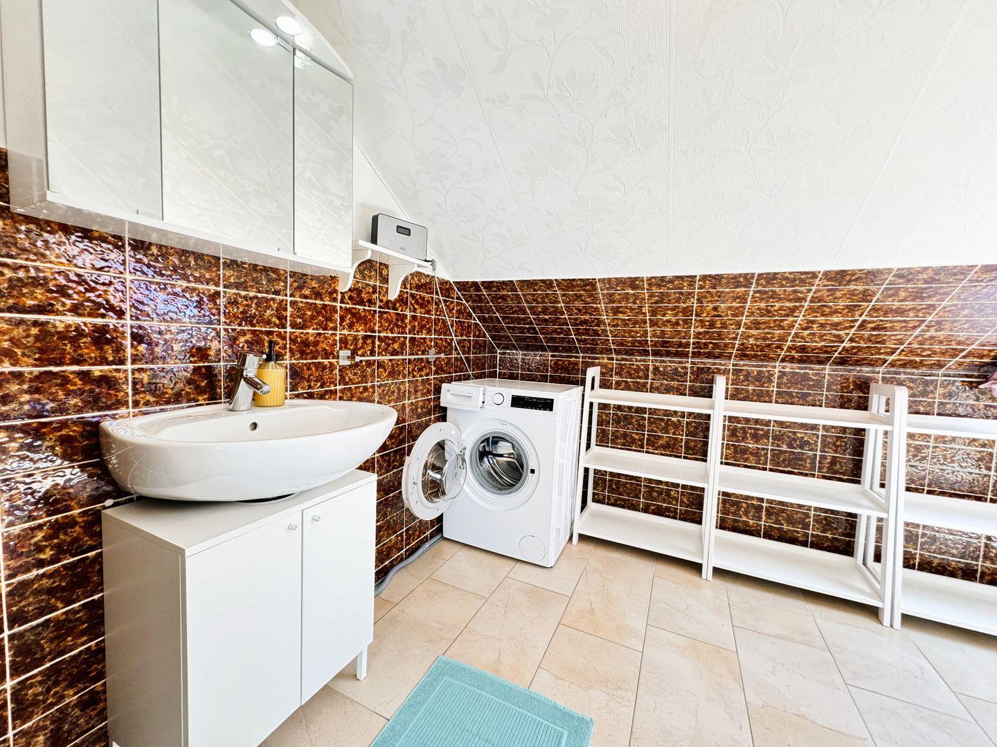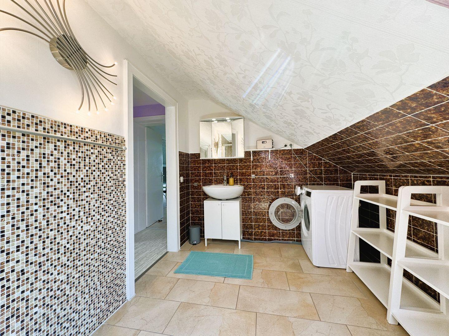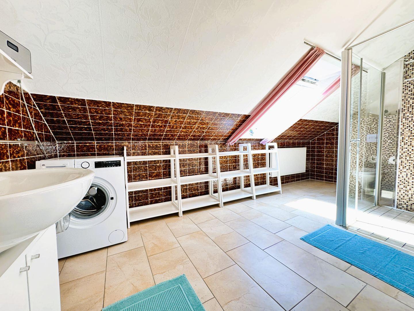 Im geräumigen Badezimmer mit Dusche und WC befindet sich ebenso eine Waschmaschine.