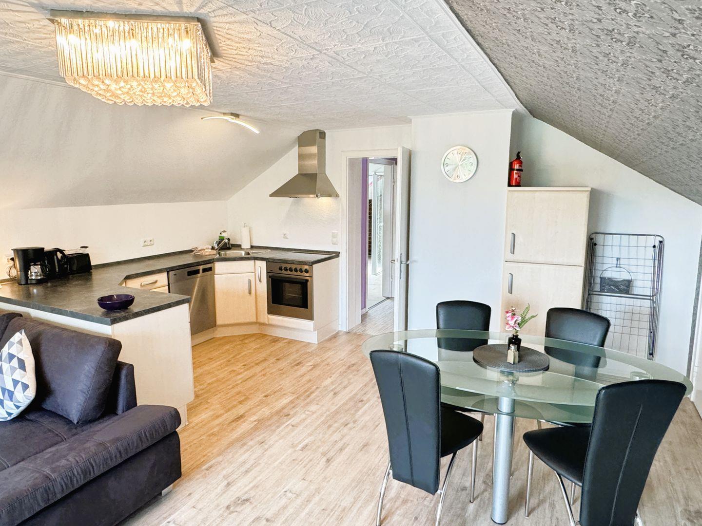 Vom großzügige Wohnbereich mit offener, komplett ausgestatteter Küche, Essbereich und Sofaecke gelangen Sie auf den Balkon. Von hier aus genießen Sie den Blick ins Grüne.