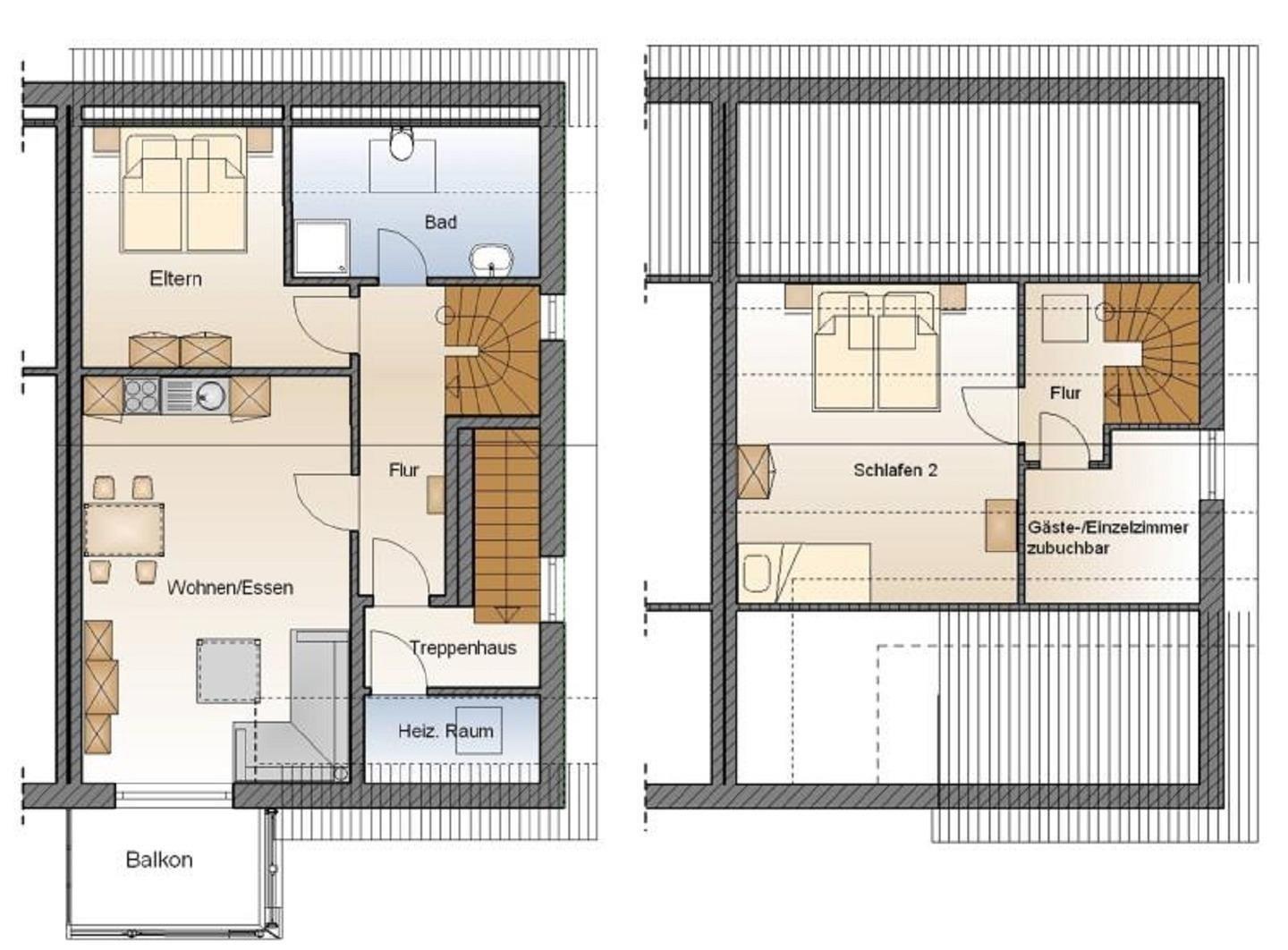 Das Badezimmer mit Dusche ist modern und komfortabel ausgestattet. Die Fußbodenheizung und der Handtuchwärmekörper sorgen für ein behaglich warmes Duschvergnügen. Einen Fön finden Sie im Waschbeckenunterschrank, eine Waschmaschine ist ebenfalls vorhanden. Eine Rolle Toilettenpapier ist zu Beginn Ihres Aufenthaltes vorhanden. Im Elternschlafzimmer befindet sich ein Doppelbett der Größe 180x200 cm. Das Kinderzimmer befindet sich im Obergeschoß und ist mit einem Doppelbett 180x200 cm und einem Einzelbett 90x200 cm ausgestattet. Reisebettchen mit Matratze, Hochstuhl und Wickelauflage sind vorhanden. Ein Einzelbett im Einbettzimmer hat die Maße 90x200 cm.