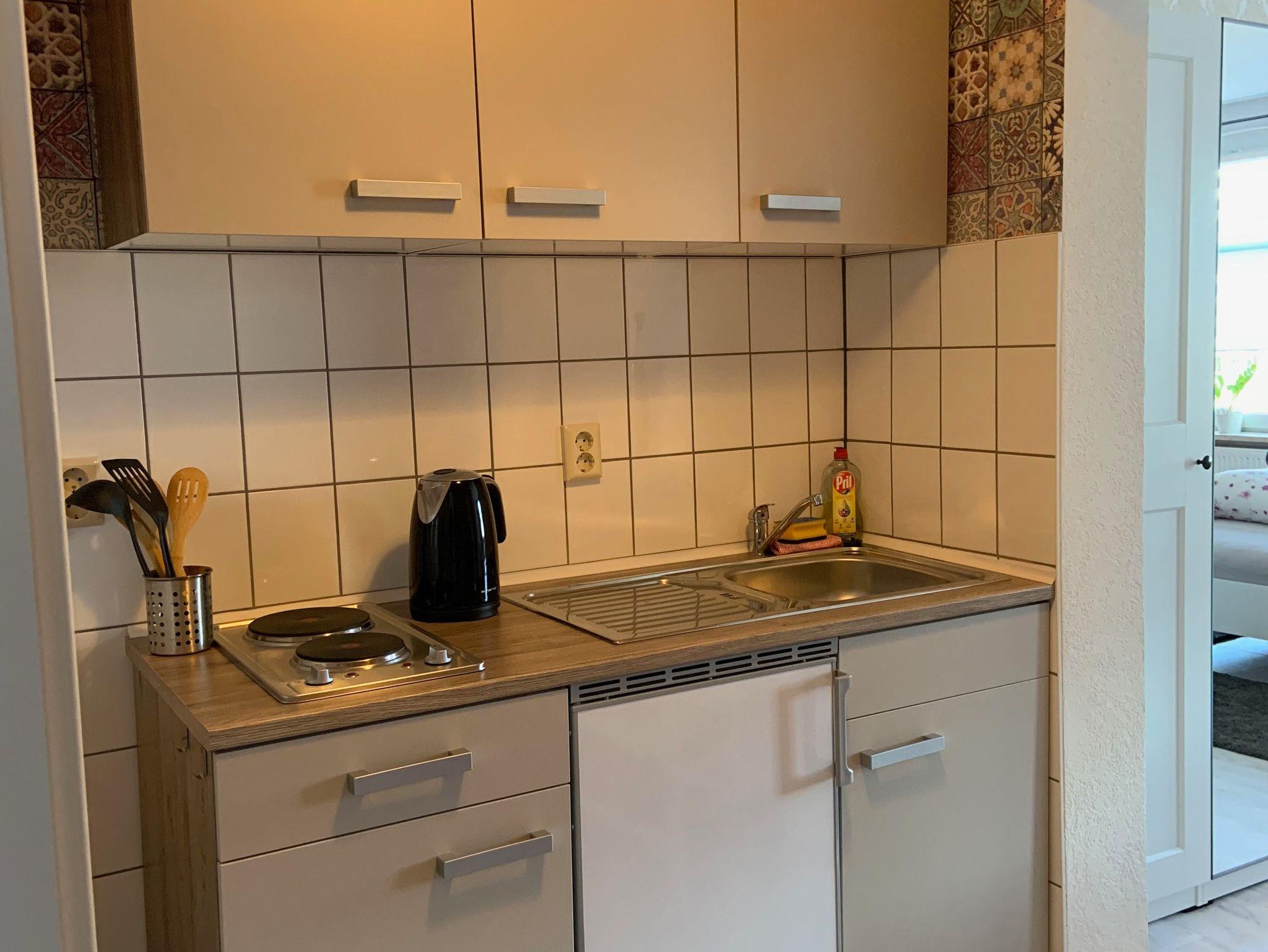 Die Küche bietet alle Annehmlichkeiten, um schnelle Köstlichkeiten zuzubereiten. Der Essbereich grenzt unmittelbar an und bieten Platz für zwei. Das Schlafzimmer Röschen ist ein Rückzugsort mit geschmackvoller Einrichtung, der für eine angenehme Nachtruhe sofort.