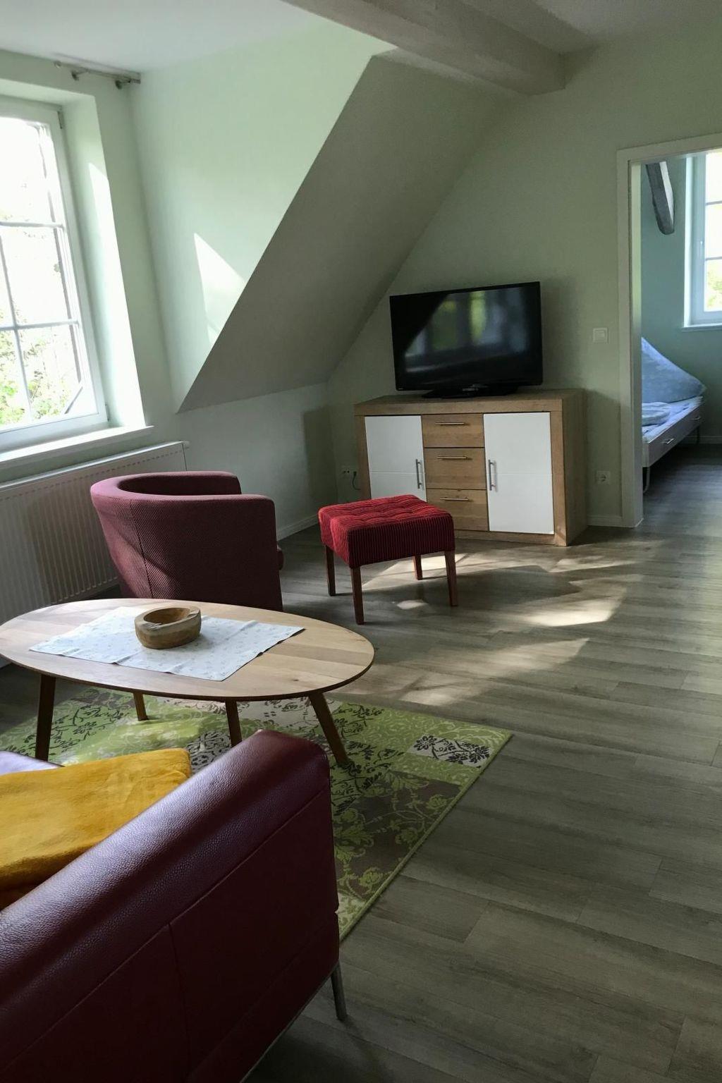 Each holiday flat can accommodate up to 4 people with a spacious living room, bathroom with shower, 1 large bedroom, a smaller bedroom and a fully equipped kitchen. The flats are located on the first floor in a converted log cabin on a private property.