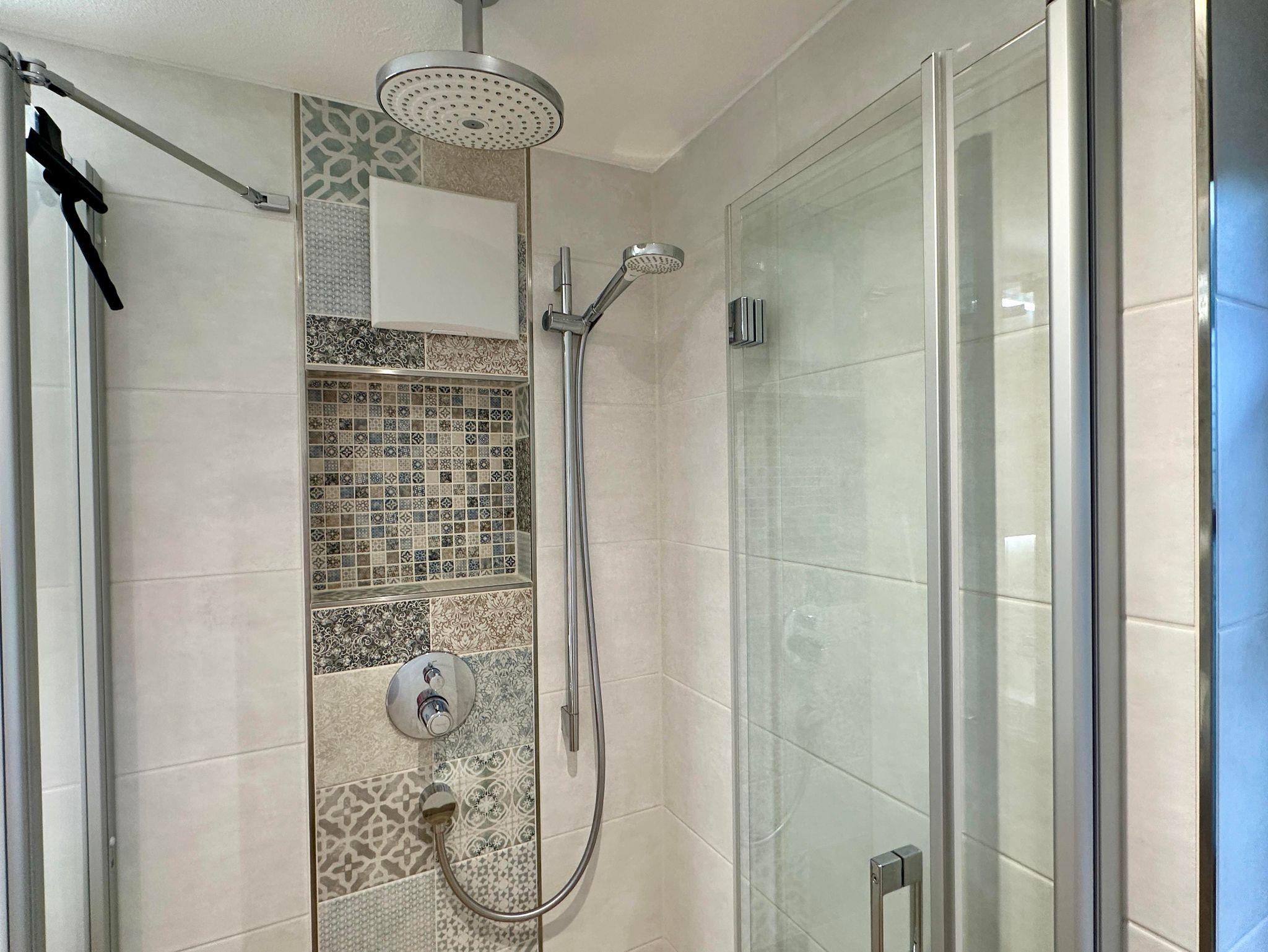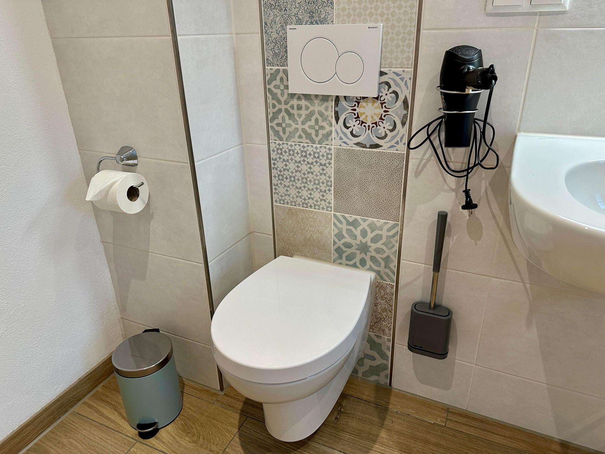 Das moderne Bad verfügt über Toilette, Waschbecken, Spiegelschrank, begehbare Dusche, Handtuchwärmer, Mülleimer, Föhn und Badhocker. Toilettenpapier und Handtücher werden euch gestellt und sind im Preis enthalten.