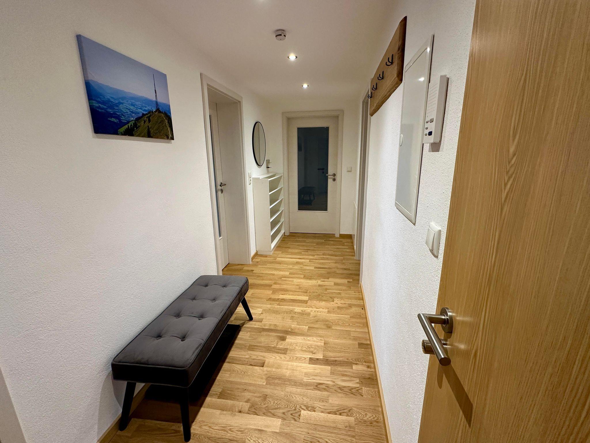 Über das Treppenhaus unseres 3 Parteienhauses kommt ihr in die Ferienwohnung, die Platz für 4 Personen (+ 1 Baby von 0-3 Jahre) bietet. Nach Betreten der Wohnung befindet ihr euch im Flur, ausgestattet mit Gardarobe, Spiegel, Schuhregal und kleiner Sitzbank. Die gesamte Wohnung ist mit Fußbodenheizung und Parkett ausgestattet.