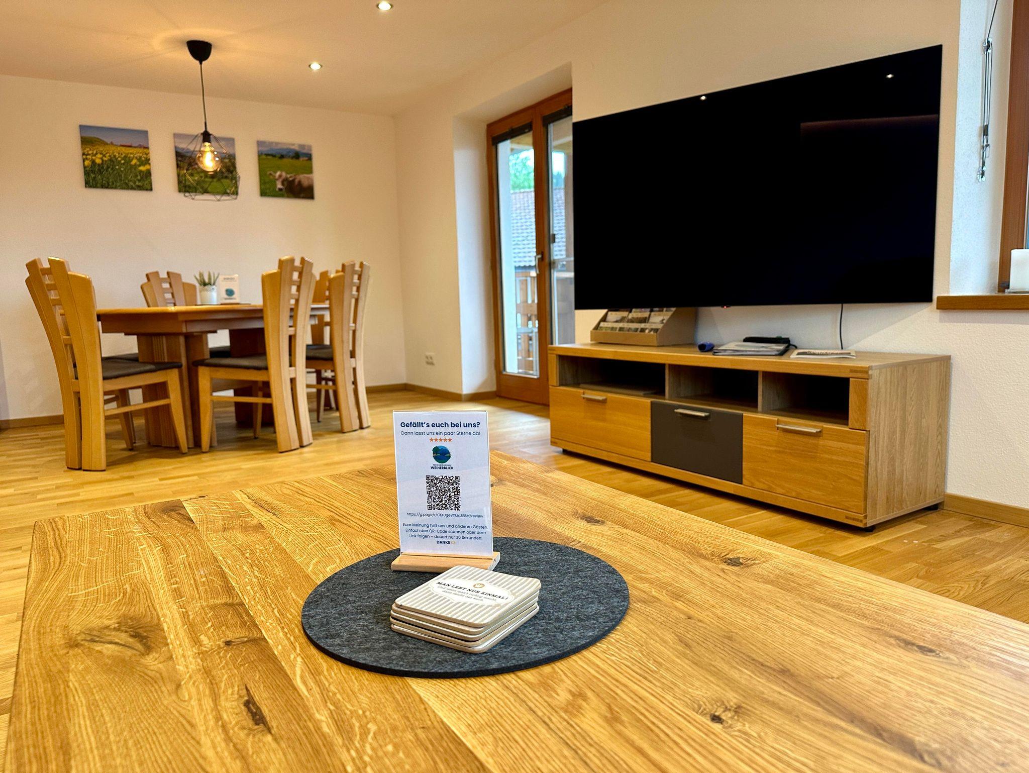 Im geräumigen Wohnzimmer findet ihr einen großen Esstisch, eine gemütliche Couch und einen Smart-TV. Flyer und Infomaterial zu Wanderungen, Radtouren, Restaurants und Erlebnissen in der Region stellen wir euch hier auch zur Verfügung. Von hier gelangt ihr auch auf den Balkon mit Essbereich, Liege und Elektrogrill.