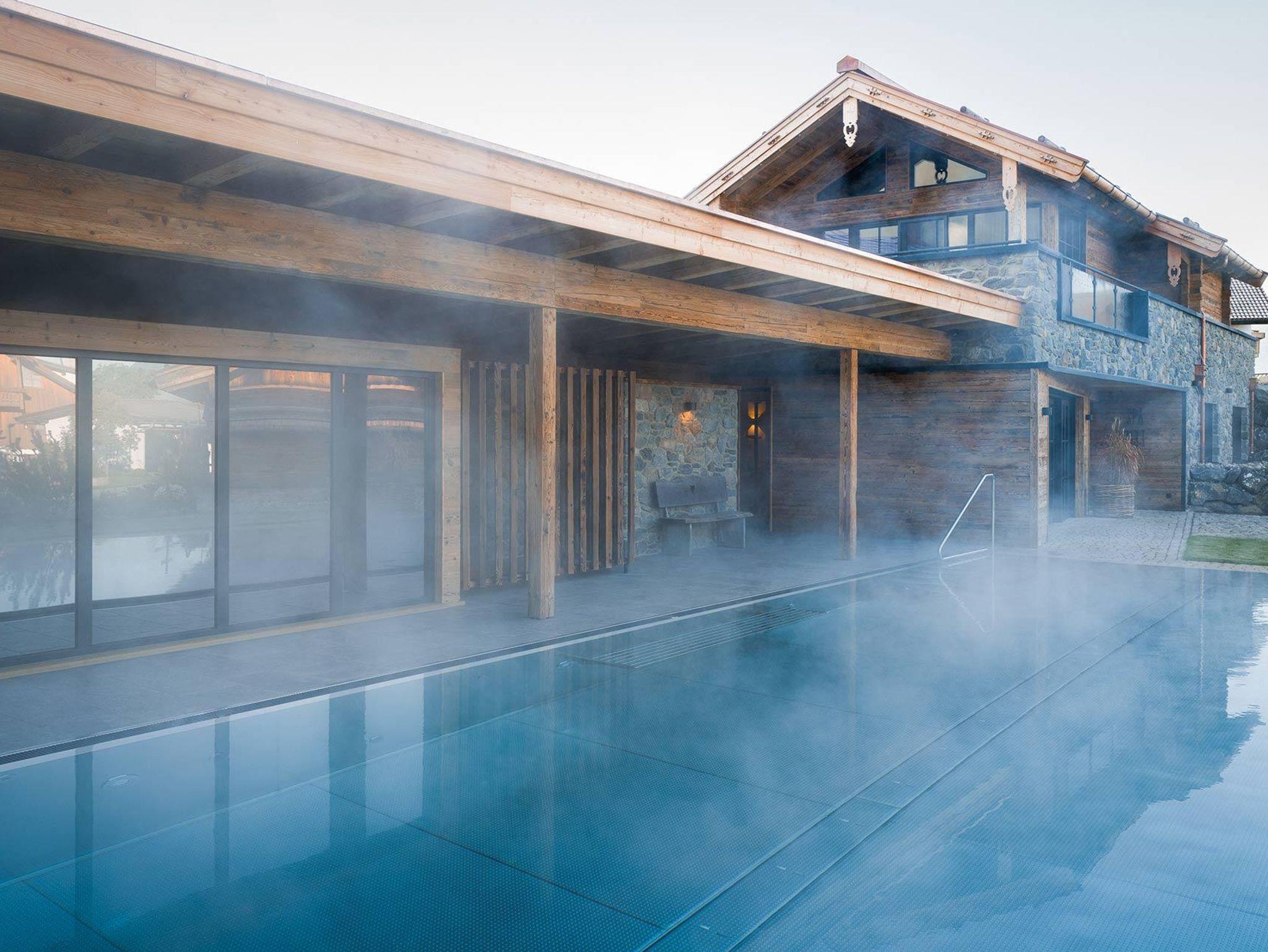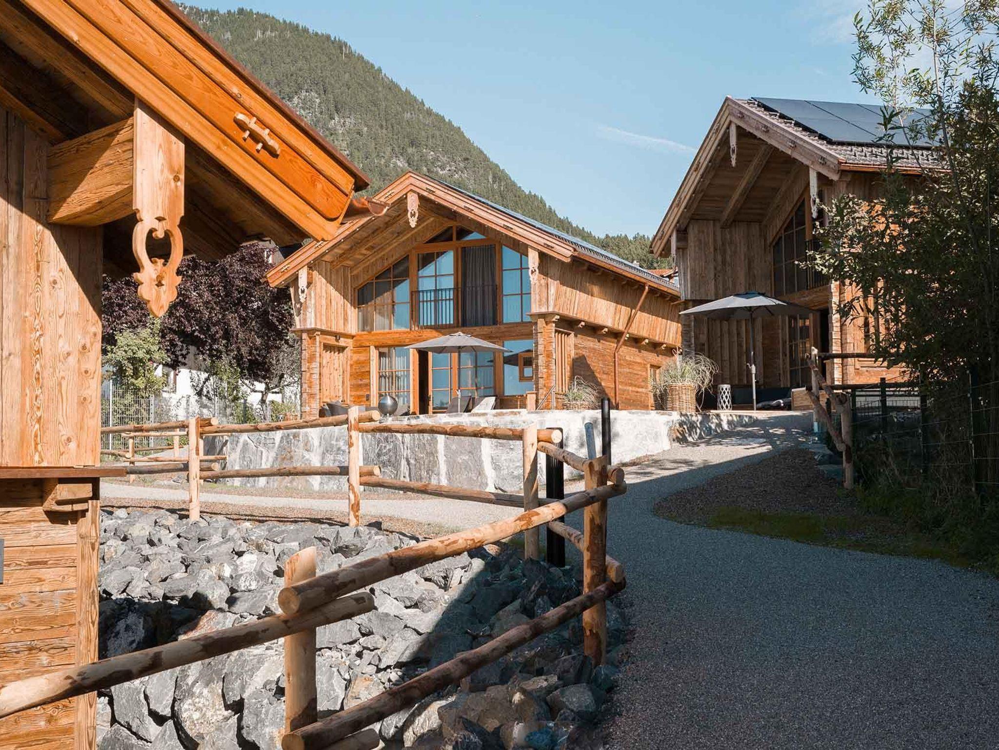 Alle neuen Chalets mit Alpzitt-Besonderheiten und eigenem Whirlpool auf der Terrasse – plus Pool, Naturbadesee & neues Spa-Gebäude.