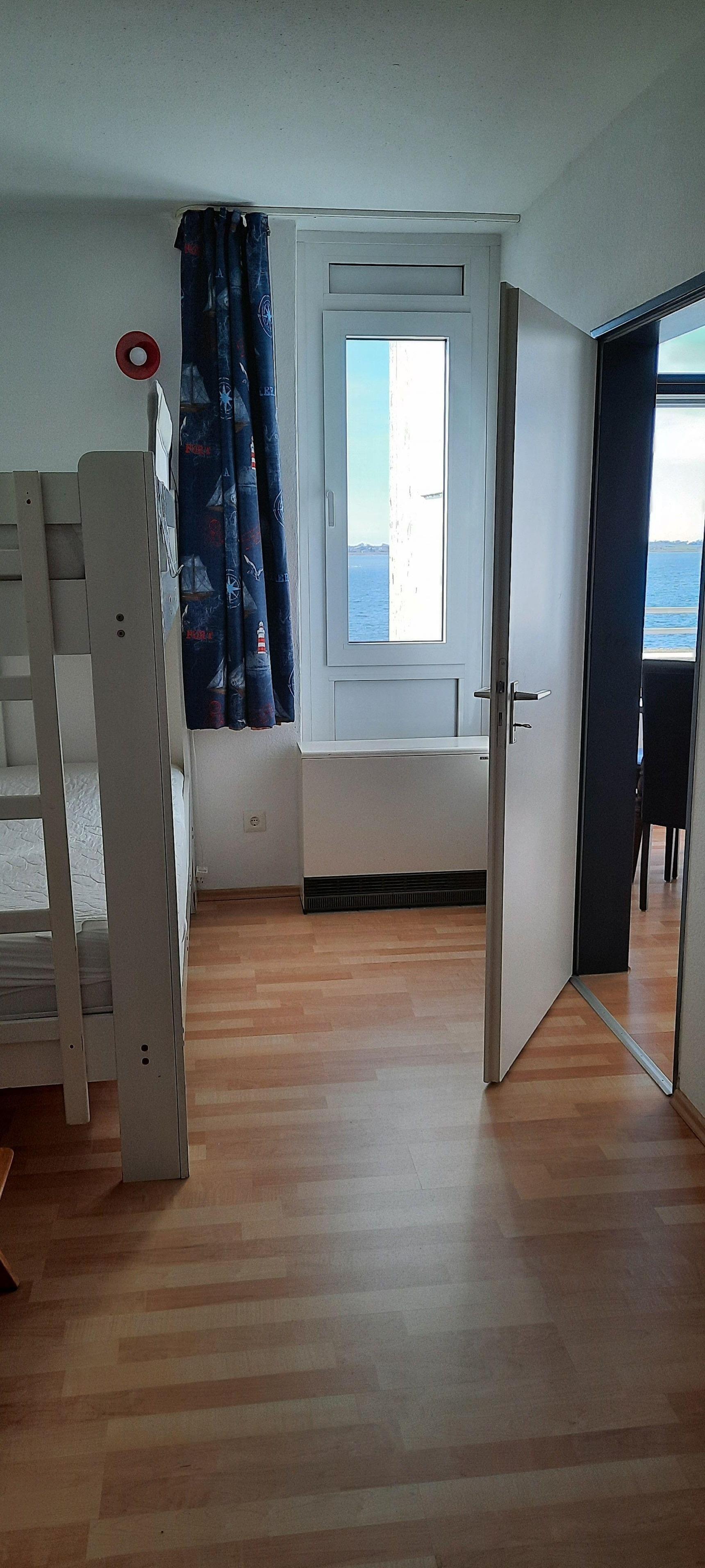 Der separate Schlafraum hat ein Etagenbett und einen Schrank und genügend Stauraum.