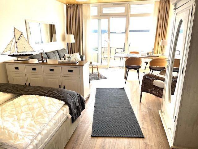 Die Räume sind hell und modern im maritimen Stil eingerichtet. Genießen Sie die Abende mit einem Glas Wein auf Ihrem Balkon.